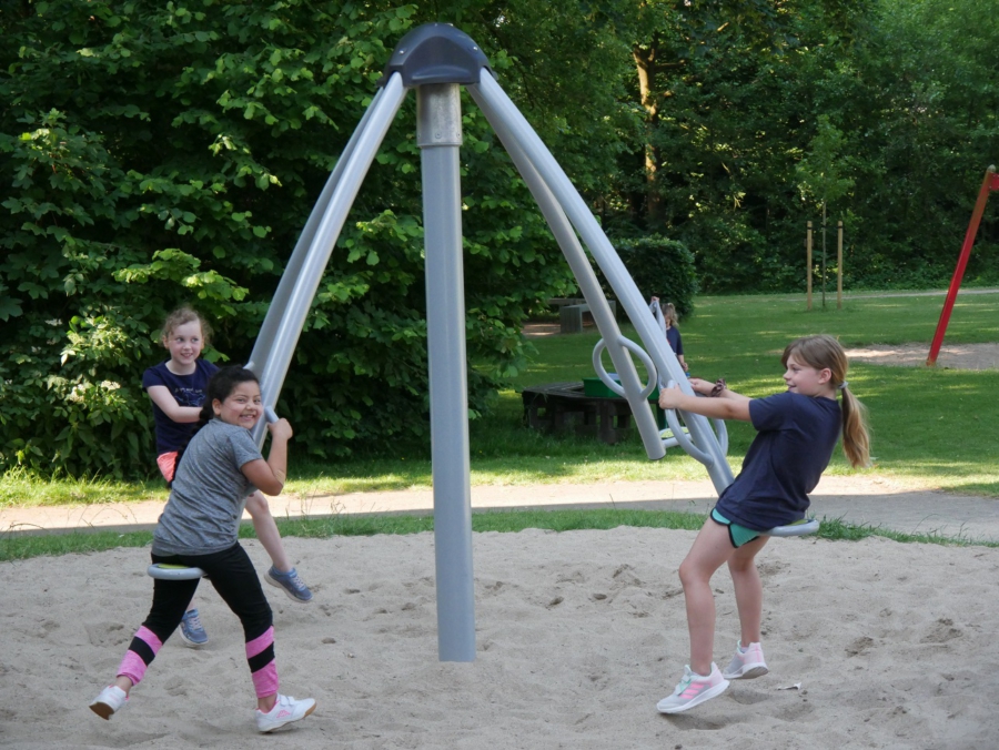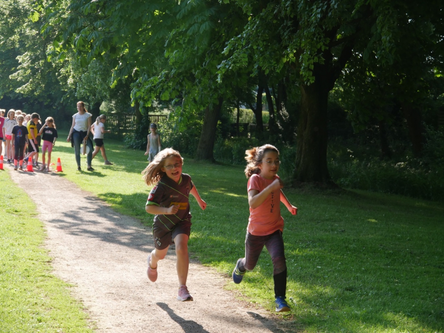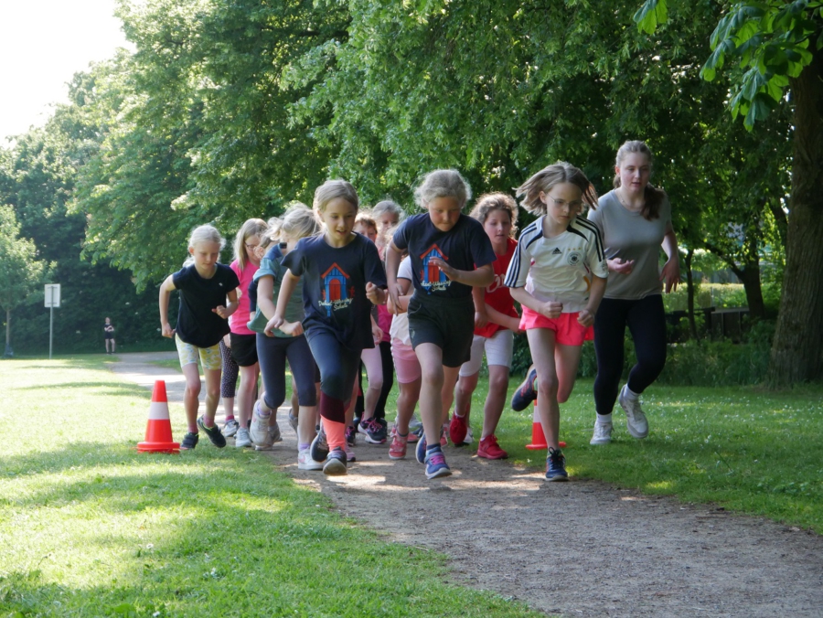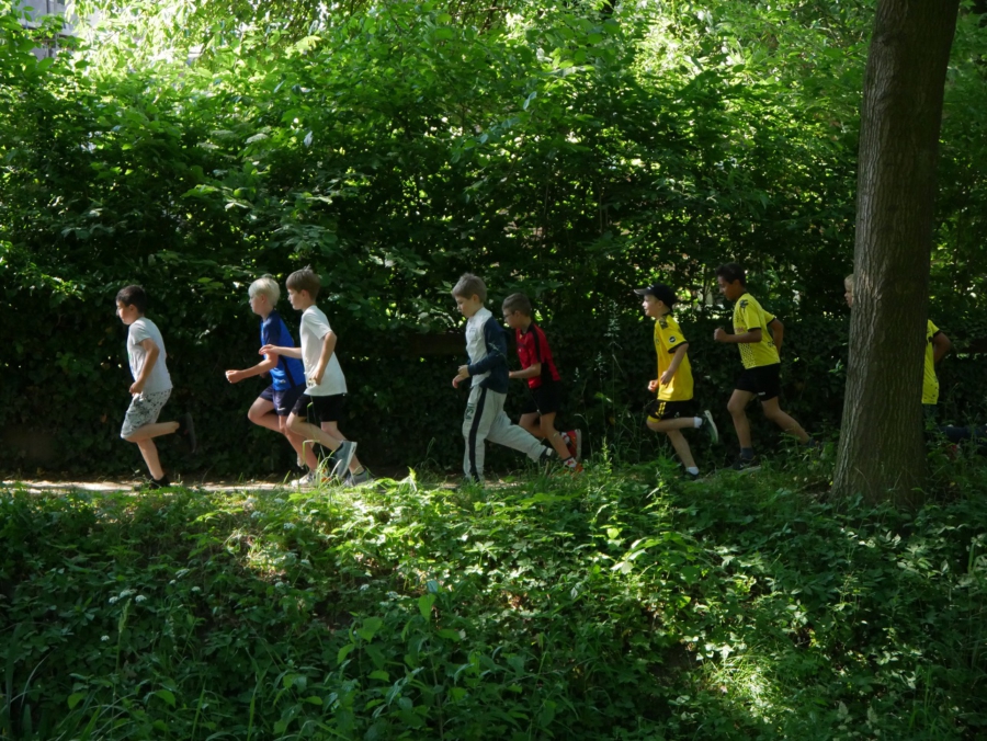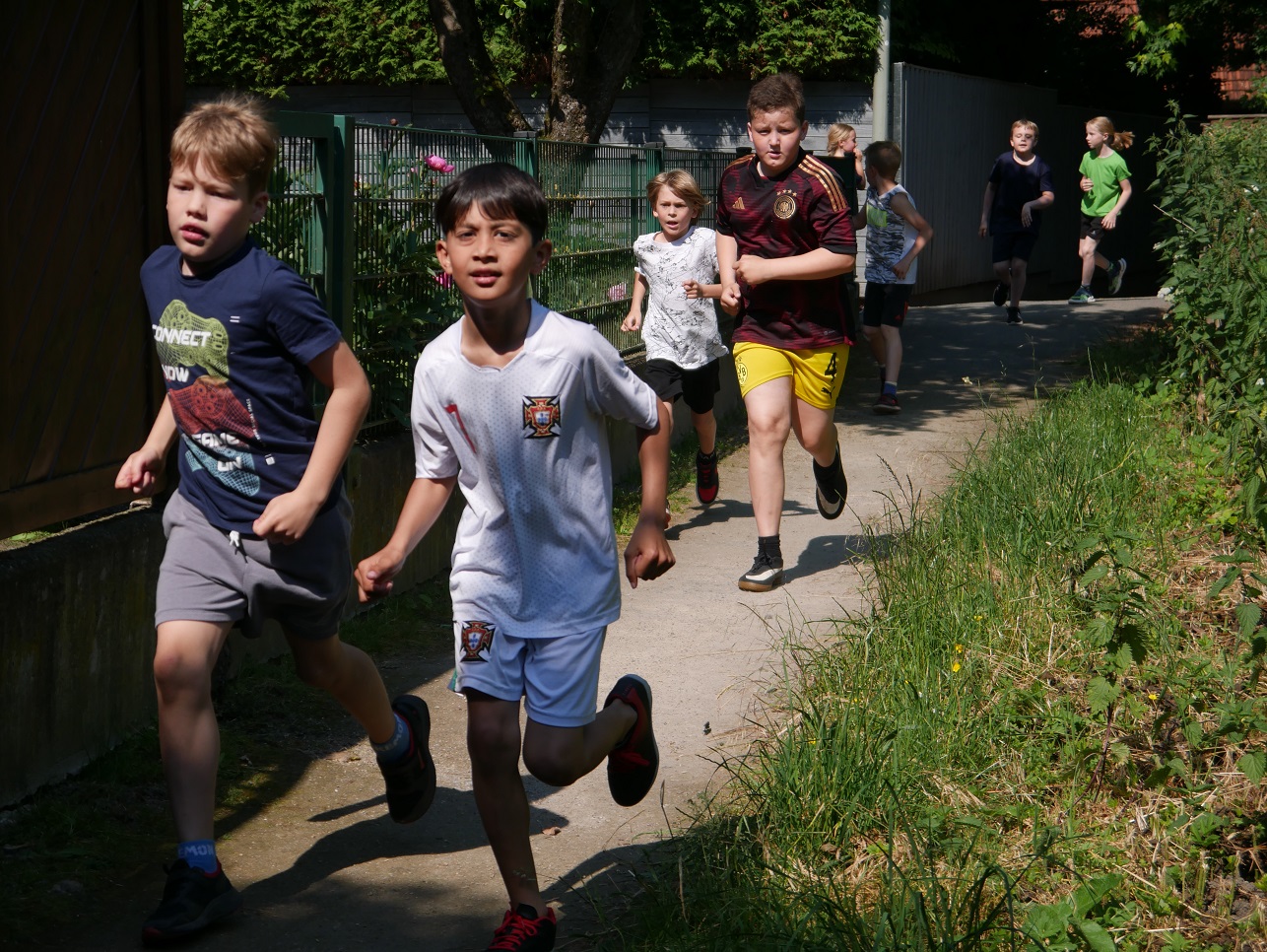 Auch hier lief Frau Viehmeyer wieder voran, ebenso wie Praktikantin Line, um den Kindern bei den warmen Temperaturen ein angemessenes Lauftempo vorzugeben.