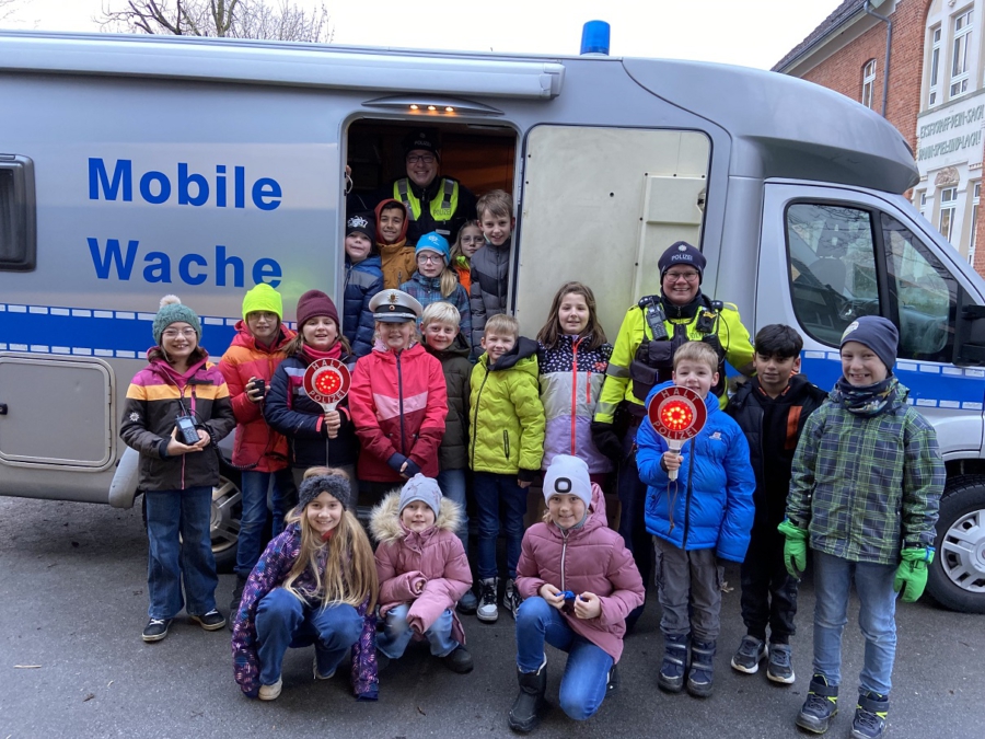 Außerdem zeigte Herr Rauer den Kindern der dritten Klasse die Mobile Wache, die eigens für die Verkehrskontrolle auf dem Schulhof der Dechant-Wessing-Schule Halt gemacht hatte.