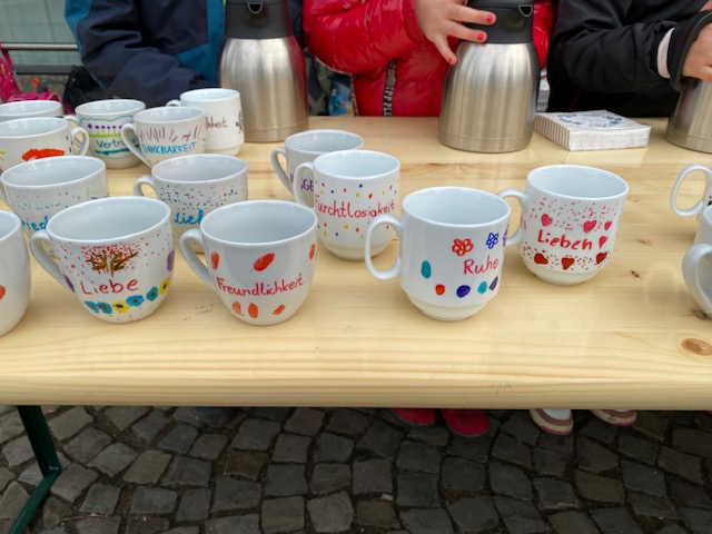 Insgesamt 120 Tassen hatte die Schule angeschafft – die Tassen wurden von den Schülern und Schülerinnen der Klasse 2b gemeinsam mit Frau Pelke als Klassenlehrerin individuell dekoriert mit farbigen Motiven und Wünschen wie „Dankbarkeit“, „Gelassenheit“ oder „Ausgeglichenheit“.