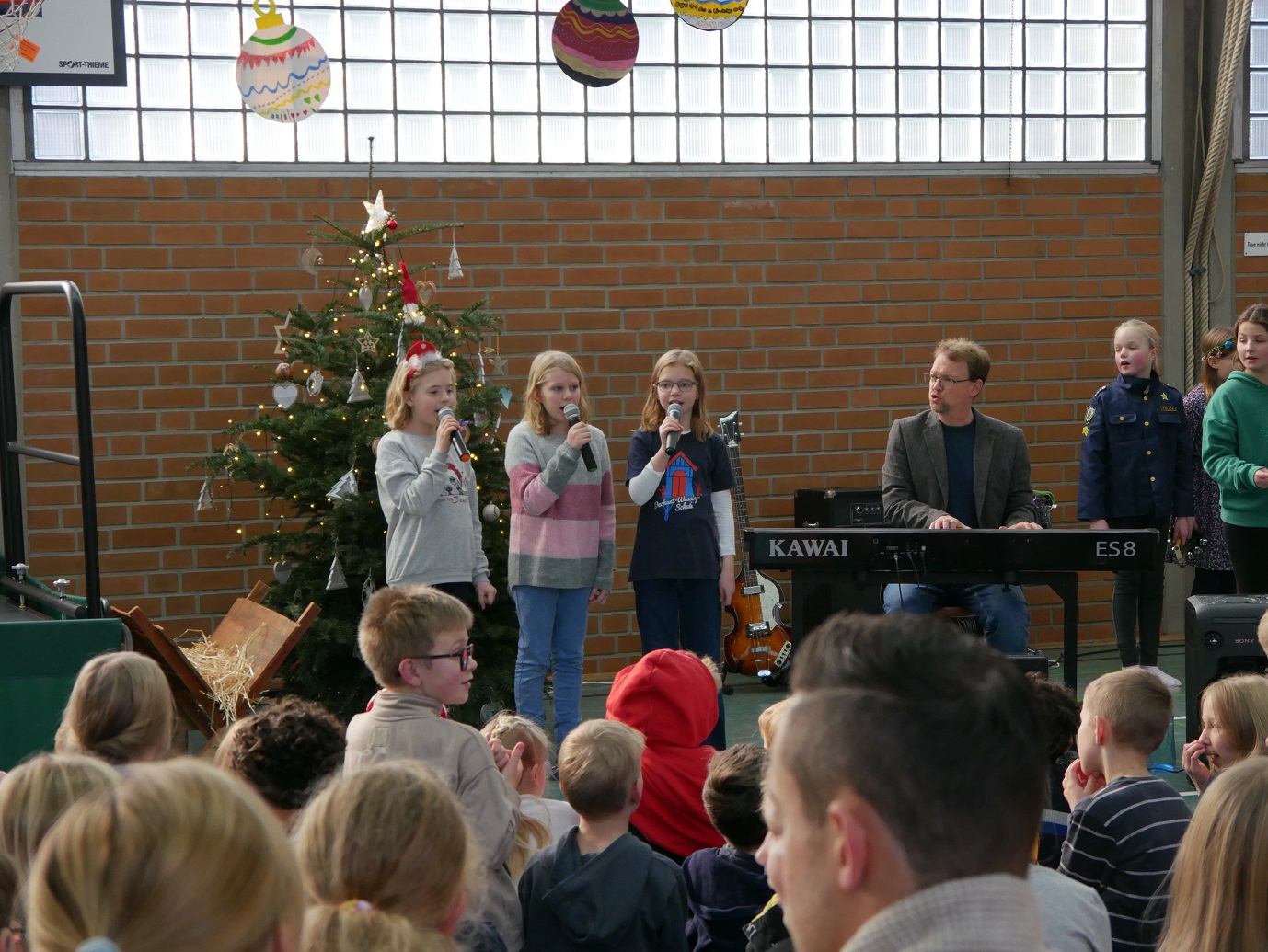 In der festlich geschmückten Turnhalle begann pünktlich um 10 Uhr die Weihnachtsfeier, eingeleitet mit dem Lied „Dicke rote Kerzen“, begleitet von Michael Mühlmann und der Schulband.