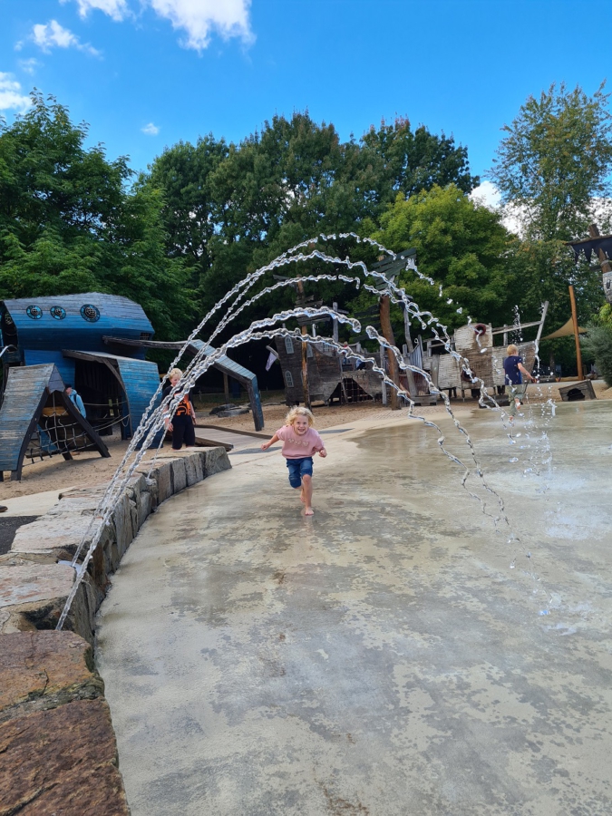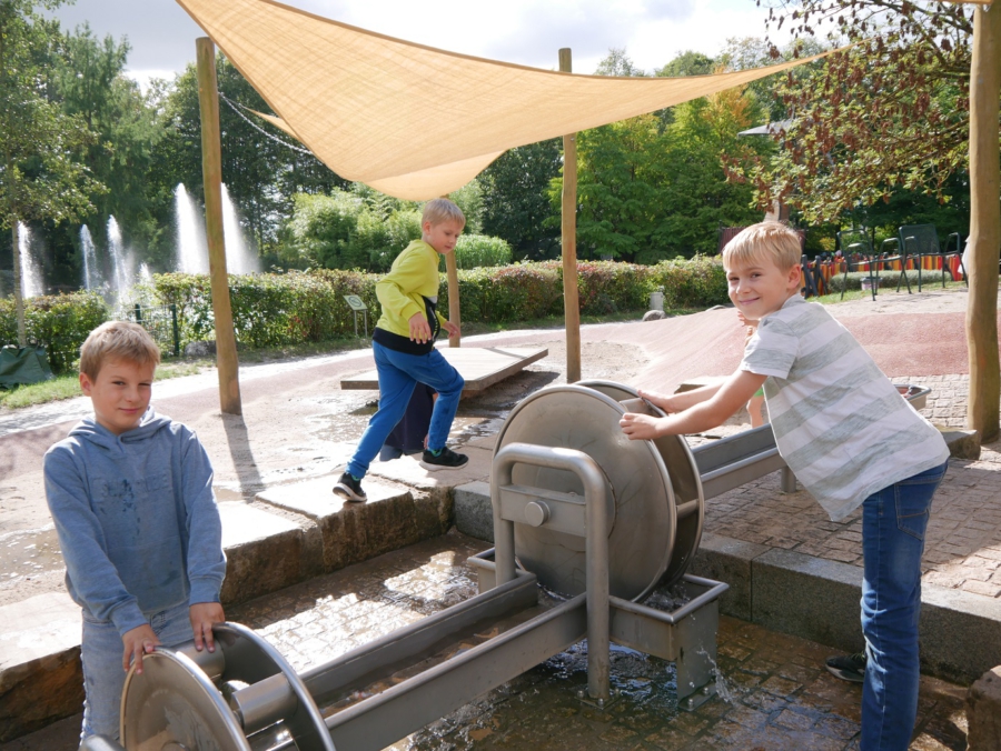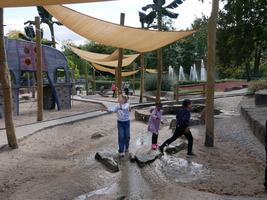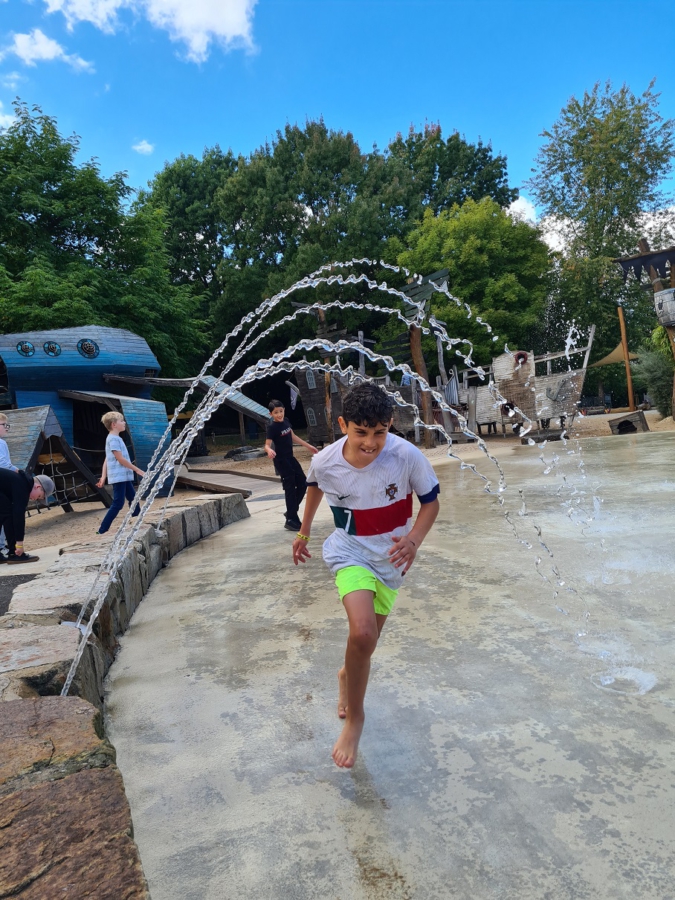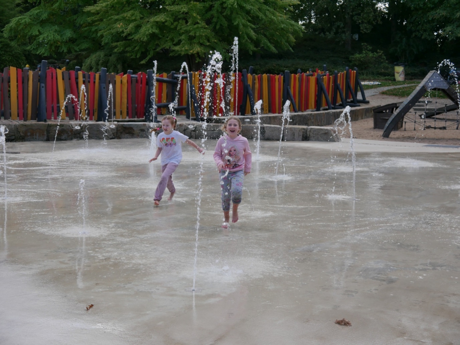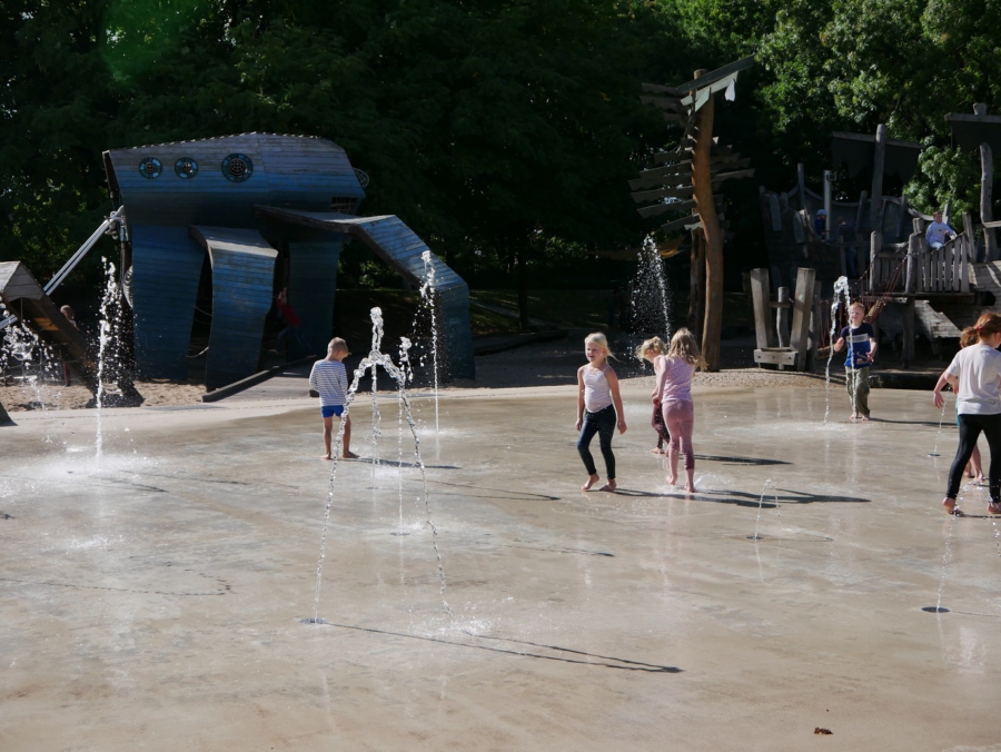 Um 12.30 Uhr trafen sich dann alle Gruppen am Wasserspielplatz – die meisten Kinder beschränkten sich dabei auf die Arbeit an den Wasserspielen, das Entern des Piratenschiffs oder das schnelle Umkurven des Fontänenfeldes. Viele hatten aber auch Wechselsachen mitgebracht und nutzten den spätsommerlichen Sonnenschein für ein letztes Planschvergnügen!