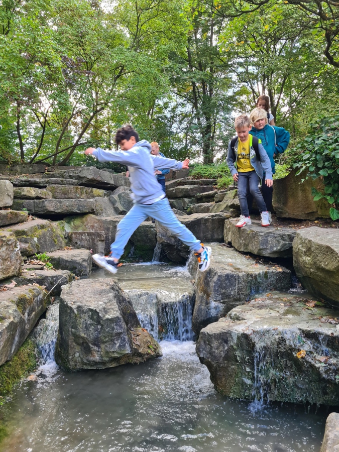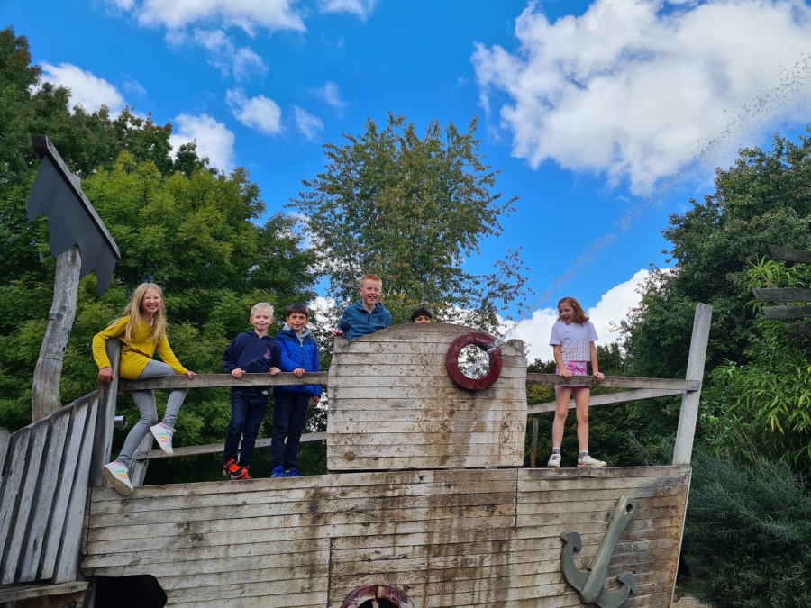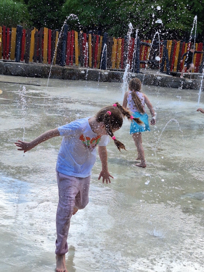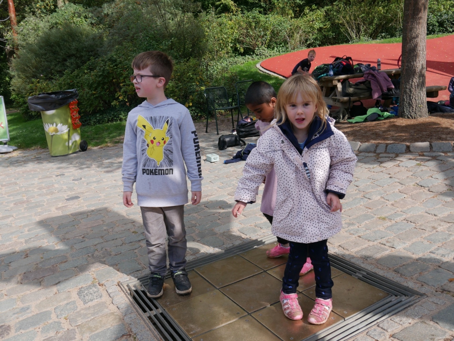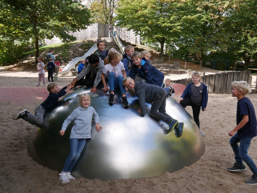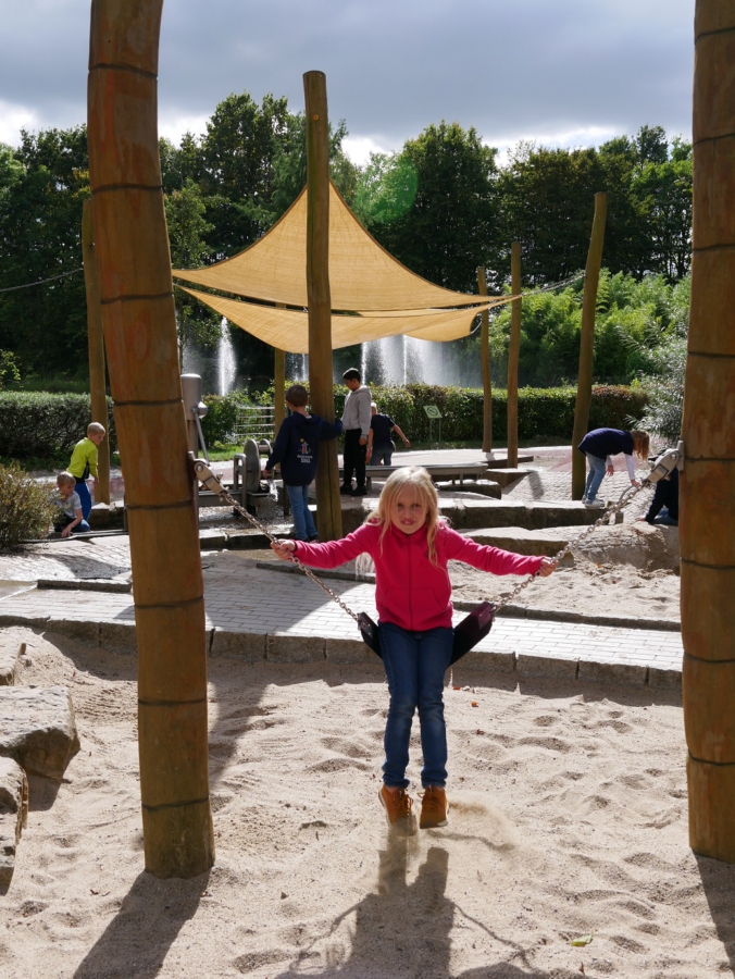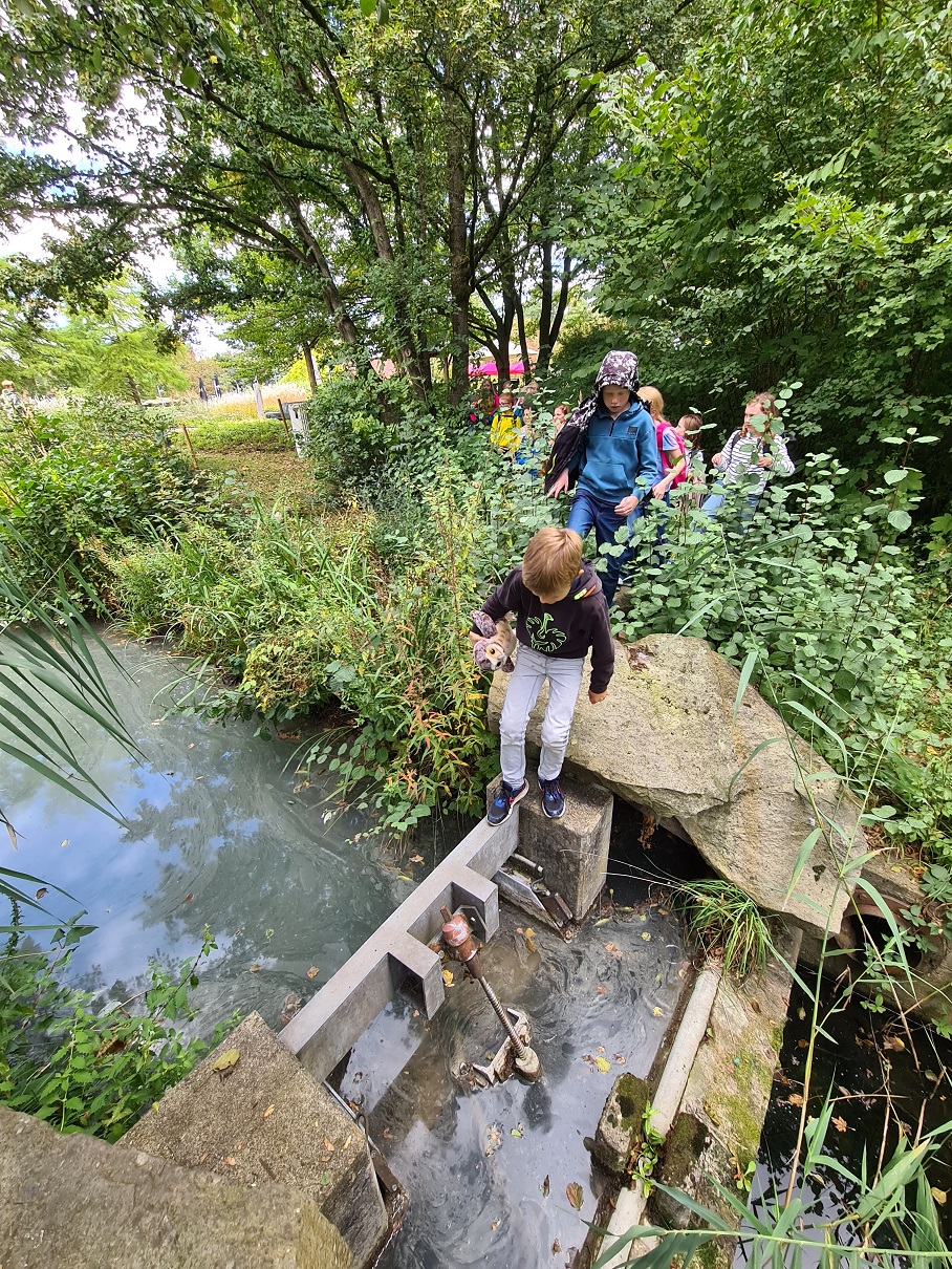 Um 12.30 Uhr trafen sich dann alle Gruppen am Wasserspielplatz – die meisten Kinder beschränkten sich dabei auf die Arbeit an den Wasserspielen, das Entern des Piratenschiffs oder das schnelle Umkurven des Fontänenfeldes. Viele hatten aber auch Wechselsachen mitgebracht und nutzten den spätsommerlichen Sonnenschein für ein letztes Planschvergnügen!
