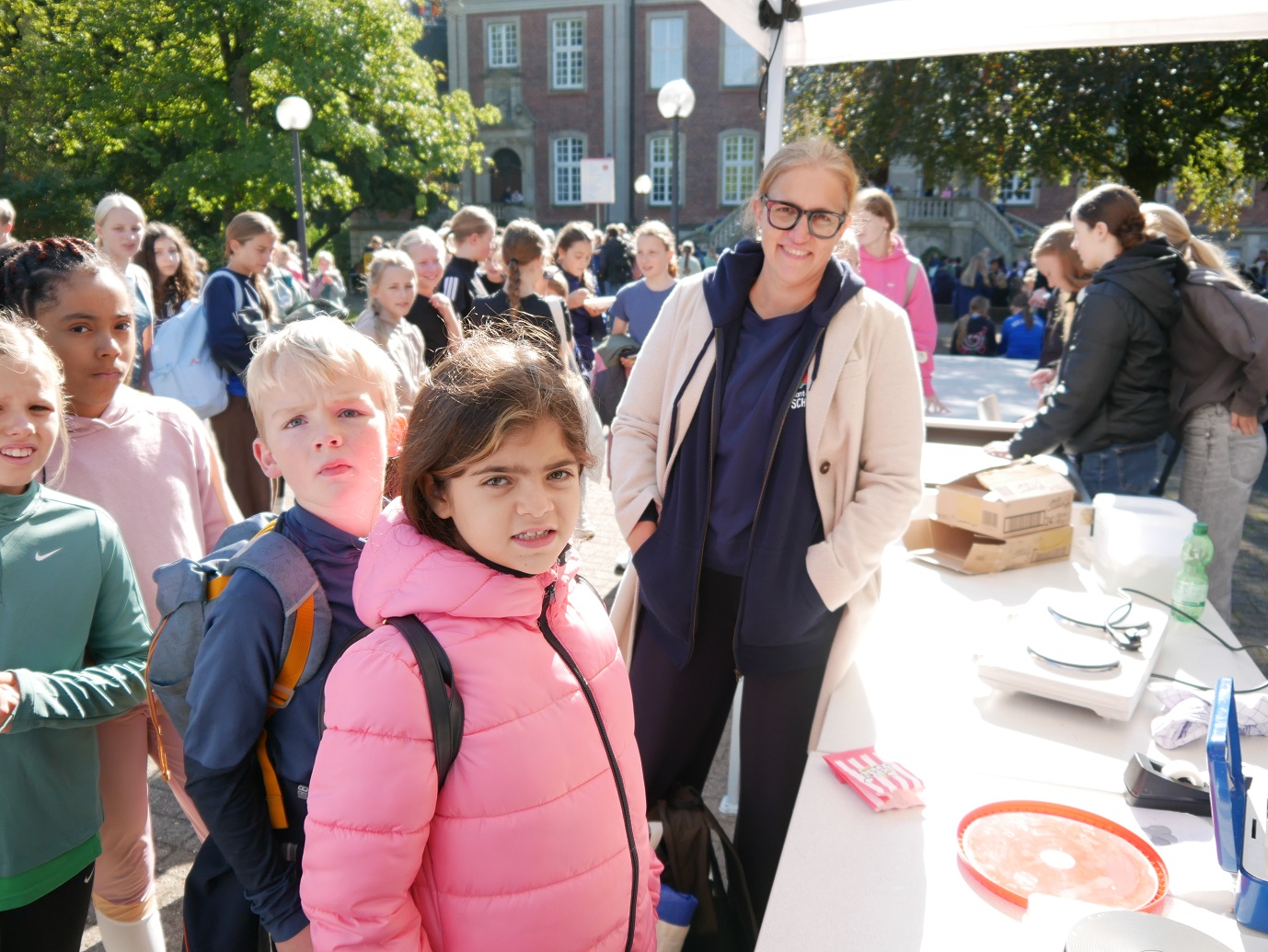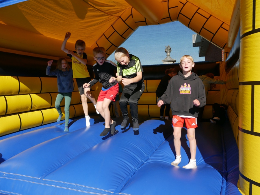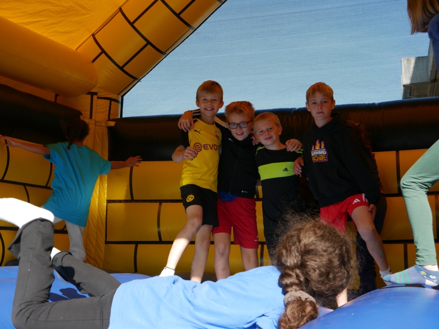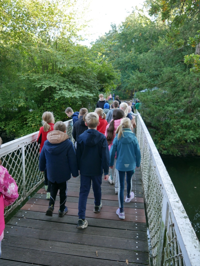 Mit 24 teilnehmenden Kindern war der 4. Jahrgang zwar zahlenmäßig dünn besetzt, aber das Motto „Dabei sein ist alles“ gilt bei dieser Veranstaltung immer besonders. Begleitet von Schulleiterin Ilka Pelke, die im zweiten und dritten Schuljahr Klassenlehrerin gewesen war, sowie Herrn Mühlmann, Klassen- und Sportlehrer der gelben Lerngruppe, erkundeten die Kinder nach der Ankunft um 9 Uhr zunächst das Gelände, den wunderschönen Park sowie das Schloss und die Schulgebäude. Überall gab es Mitmachangebote, z.B. Minigolf, Experimente, Fotostation oder „Kino“, wie immer bestens organisiert.