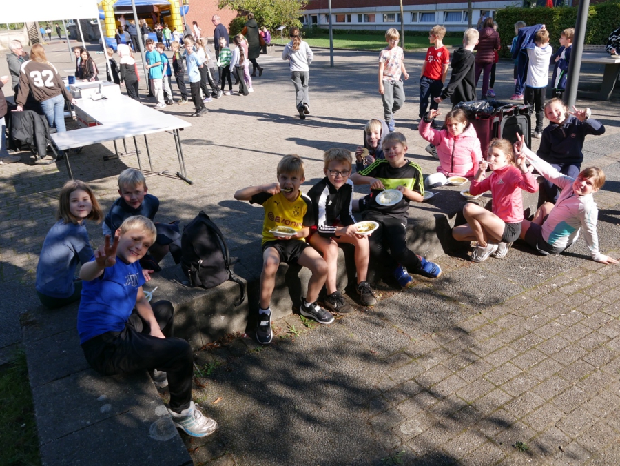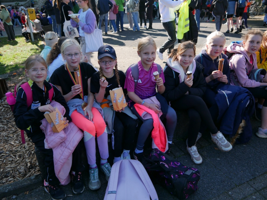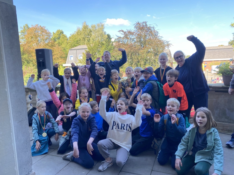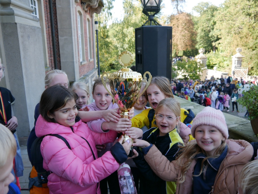 Und dann kam der große Augenblick: Bei der Ehrung der schnellsten Mädchen und Jungen waren die Kinder der DWS zunächst noch leer ausgegangen. Aber dann wurde die Siegerschule verkündet, „eine Schule, die wir in all den Jahren noch nie als Sieger hatten“, wie Organisator Patrick Thelen erklärte, „die Dechant-Wessing-Schule aus Hoetmar!“