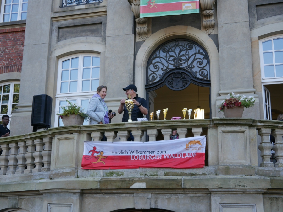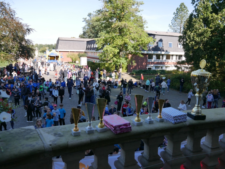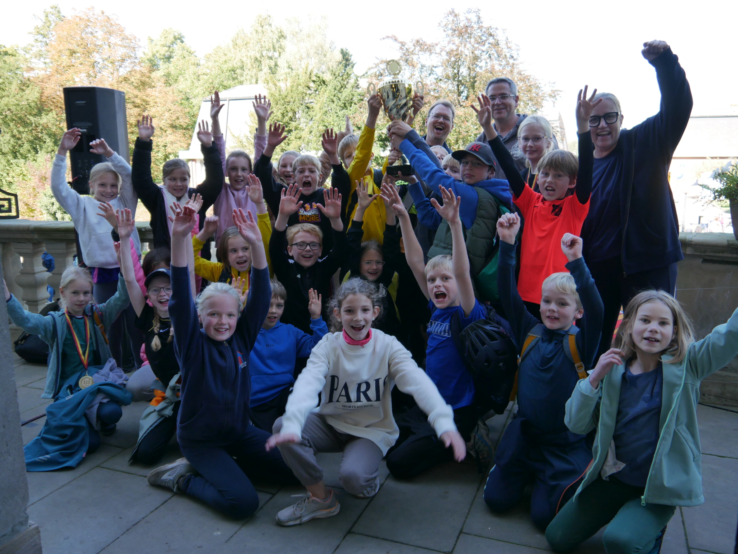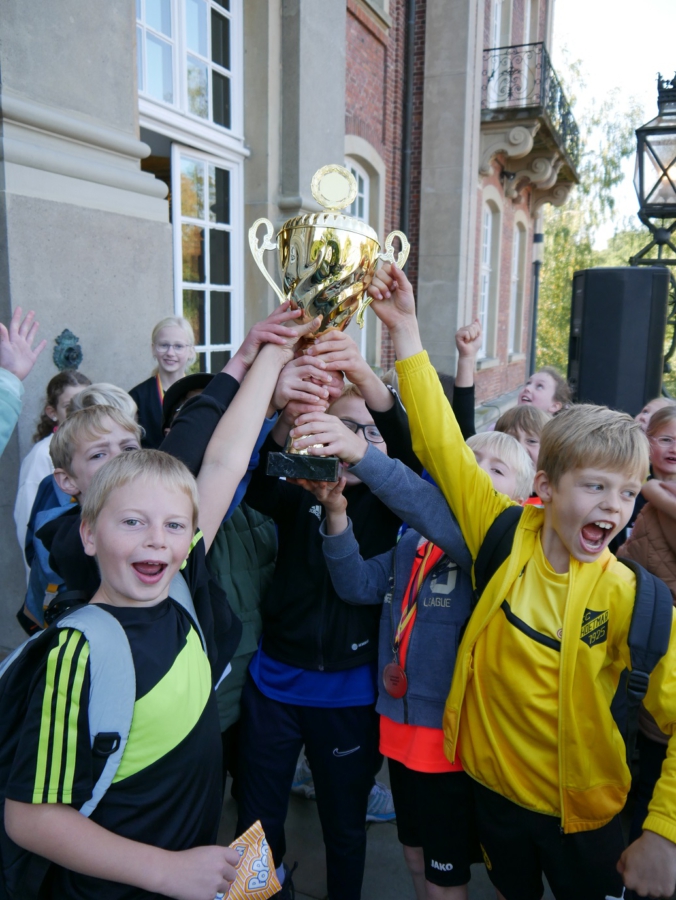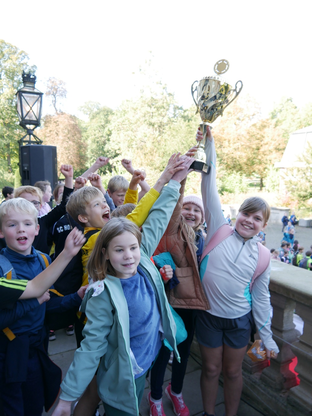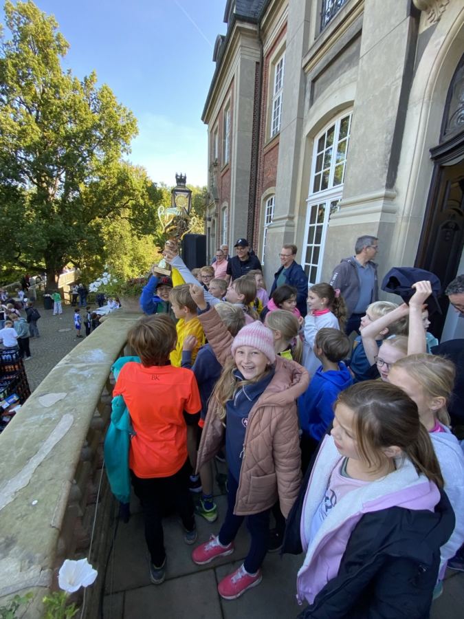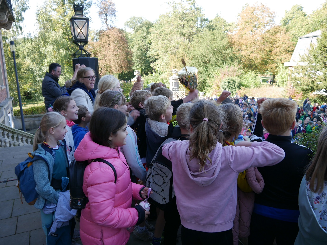 Was für eine riesige Überraschung, damit hatte niemand gerechnet! Der Jubel bei Kindern und Begleitern kannte keine Grenzen! Schnell bahnten sie sich den Weg bis auf die Empore der Schlosstreppe, wo sie den riesigen Siegerpokal entgegennehmen und gemeinsam hochhalten durften! „We are the champions“ erklang aus den Lautsprechern, alle schrien und jubelten und waren aus dem Häuschen – es war ein unvergesslicher Moment!