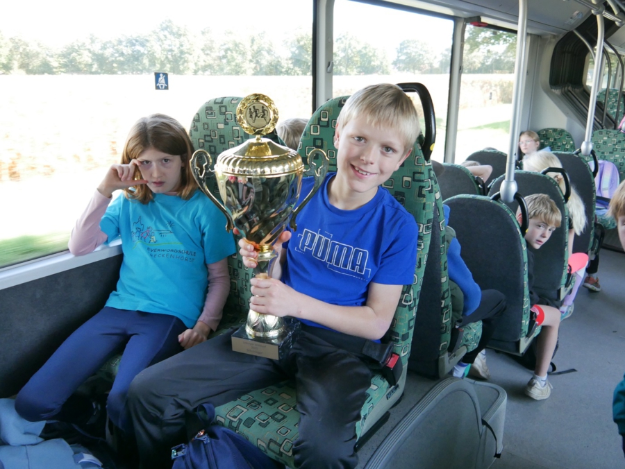 Auch während der Busfahrt nach Hause wurde kräftig weitergefeiert und gesungen, bis Frau Pelke den großen Pokal auf einen Ehrenplatz im Eingangsbereich der Schule aufstellen konnte.