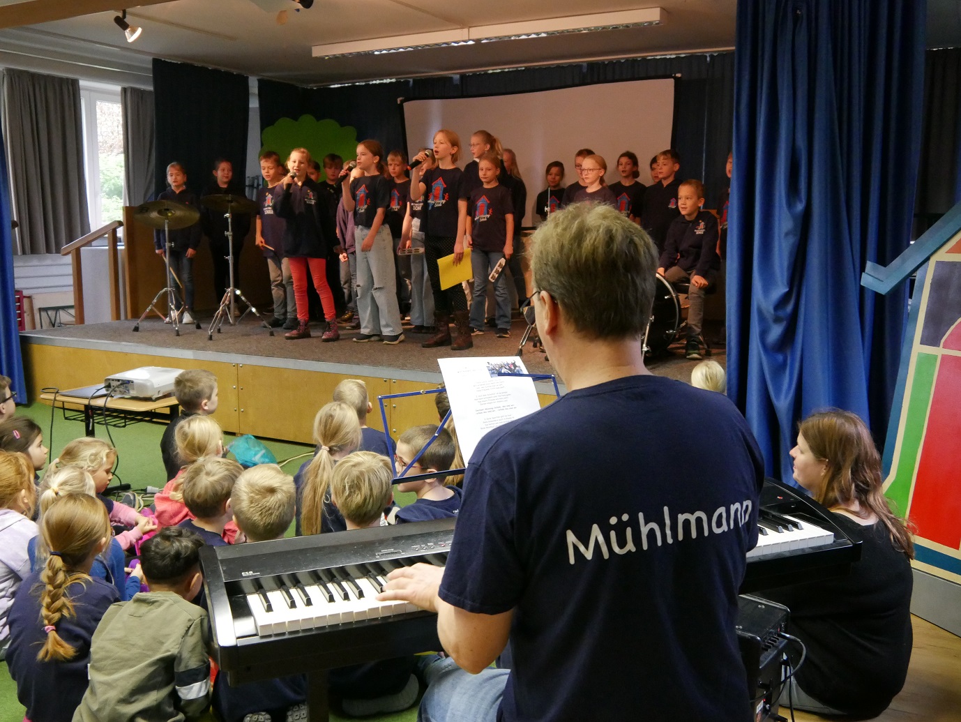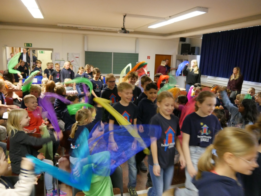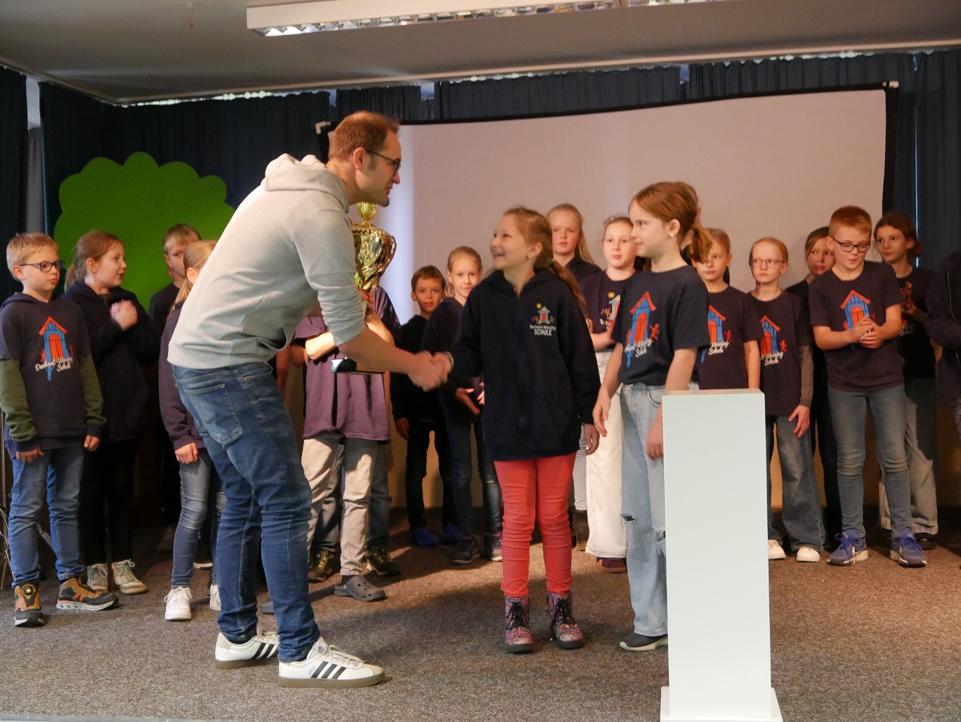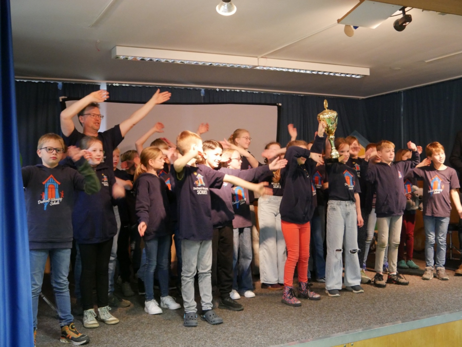 Herr Mühlmann hatte noch einen passenden „Pokalsong“ getextet, so dass alle gemeinsam „DWS – wir haben den Pokal!“ schmettern konnten, begleitet von Kindern des gelben Lernhauses.