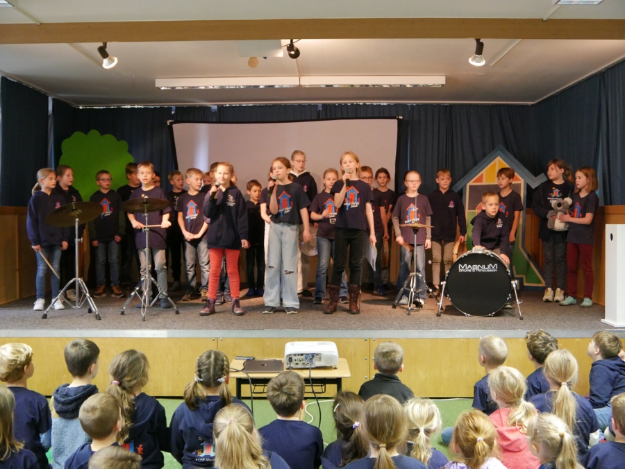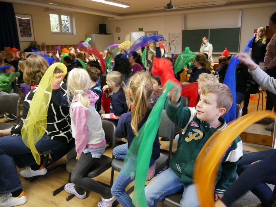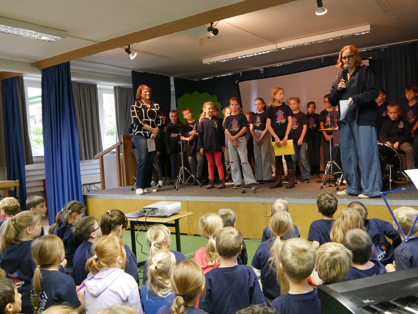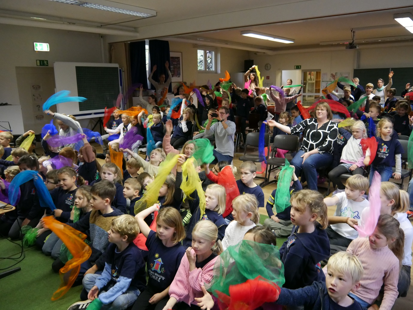 Herr Mühlmann hatte noch einen passenden „Pokalsong“ getextet, so dass alle gemeinsam „DWS – wir haben den Pokal!“ schmettern konnten, begleitet von Kindern des gelben Lernhauses.