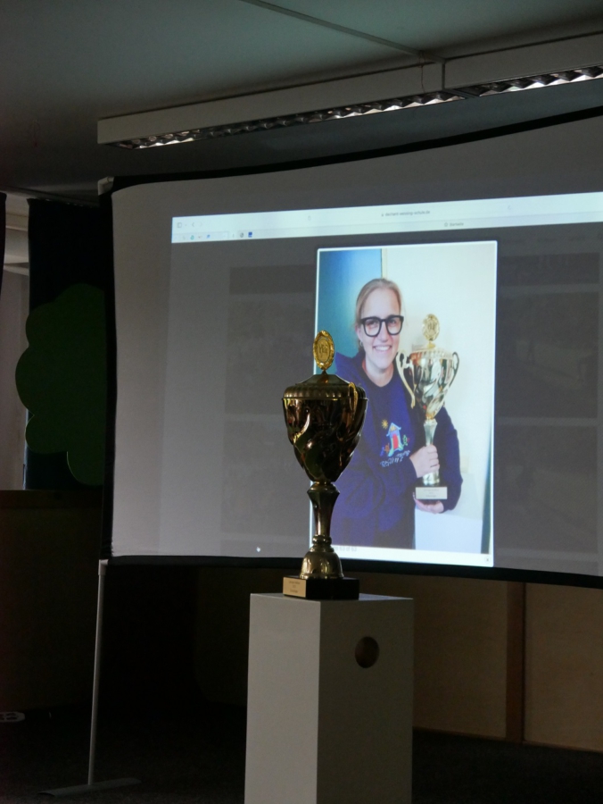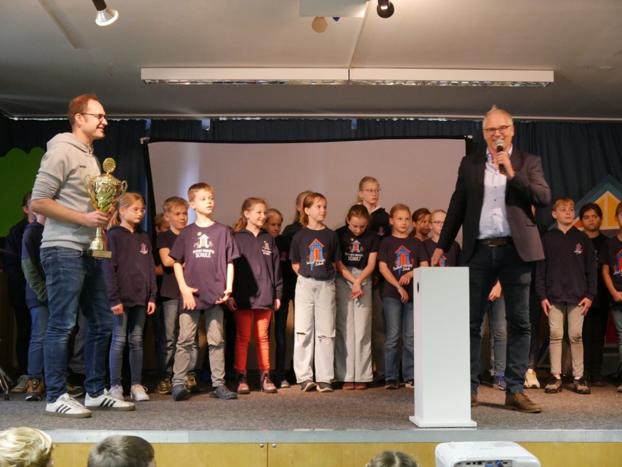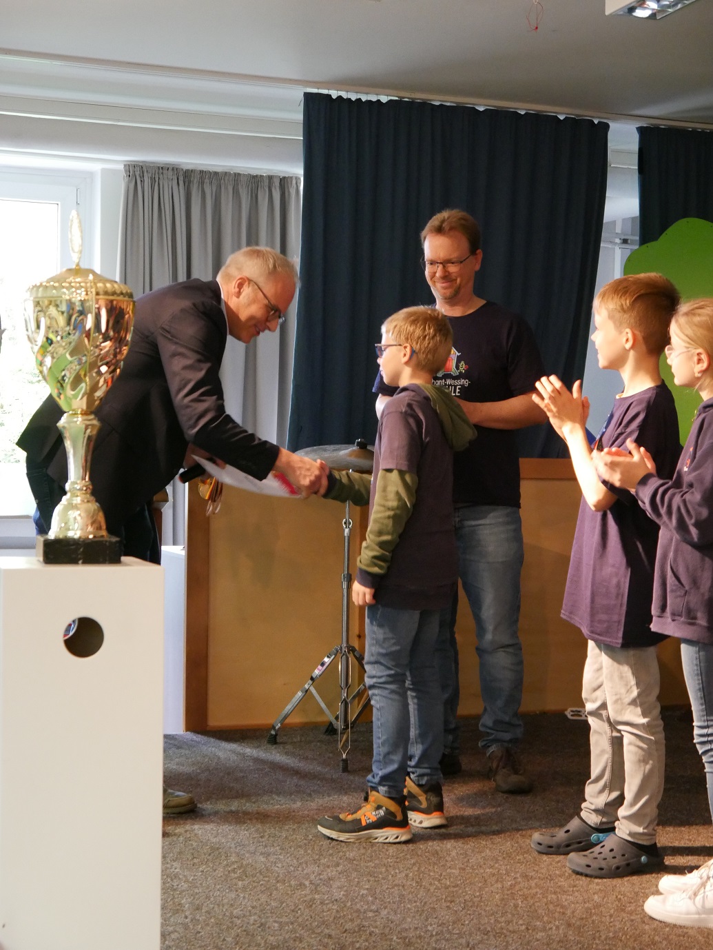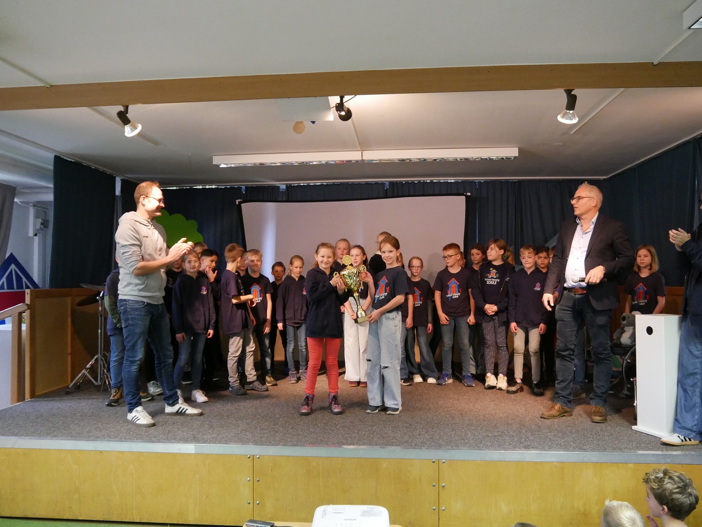 Nun waren die Organisatoren Patrick Thelen und Thorsten Wanke extra noch einmal an die Schule gekommen, um den großen Siegerpokal offiziell zu übergeben.