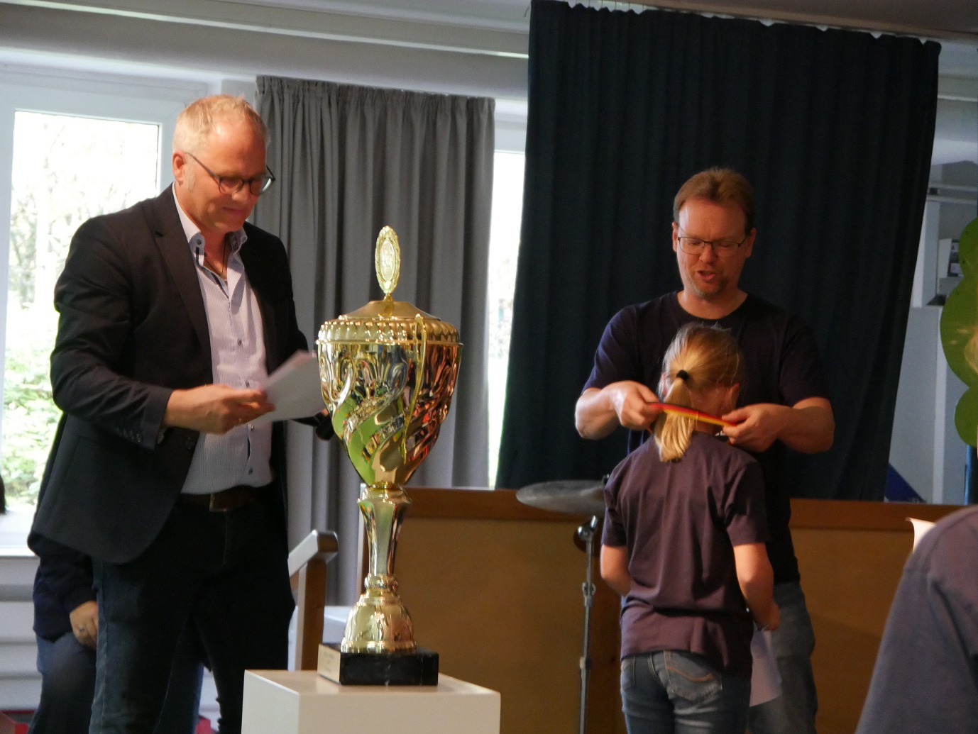 Herr Thelen und Herr Wanke zeigten sich sehr beeindruckt von der tollen Stimmung und überreichten zu „We are the champions“ den riesigen Pokal an die Kinder der Klasse 4. Diese erhielten außerdem noch eine Urkunde und Siegermedaillen, ebenso wie die Begleitpersonen.