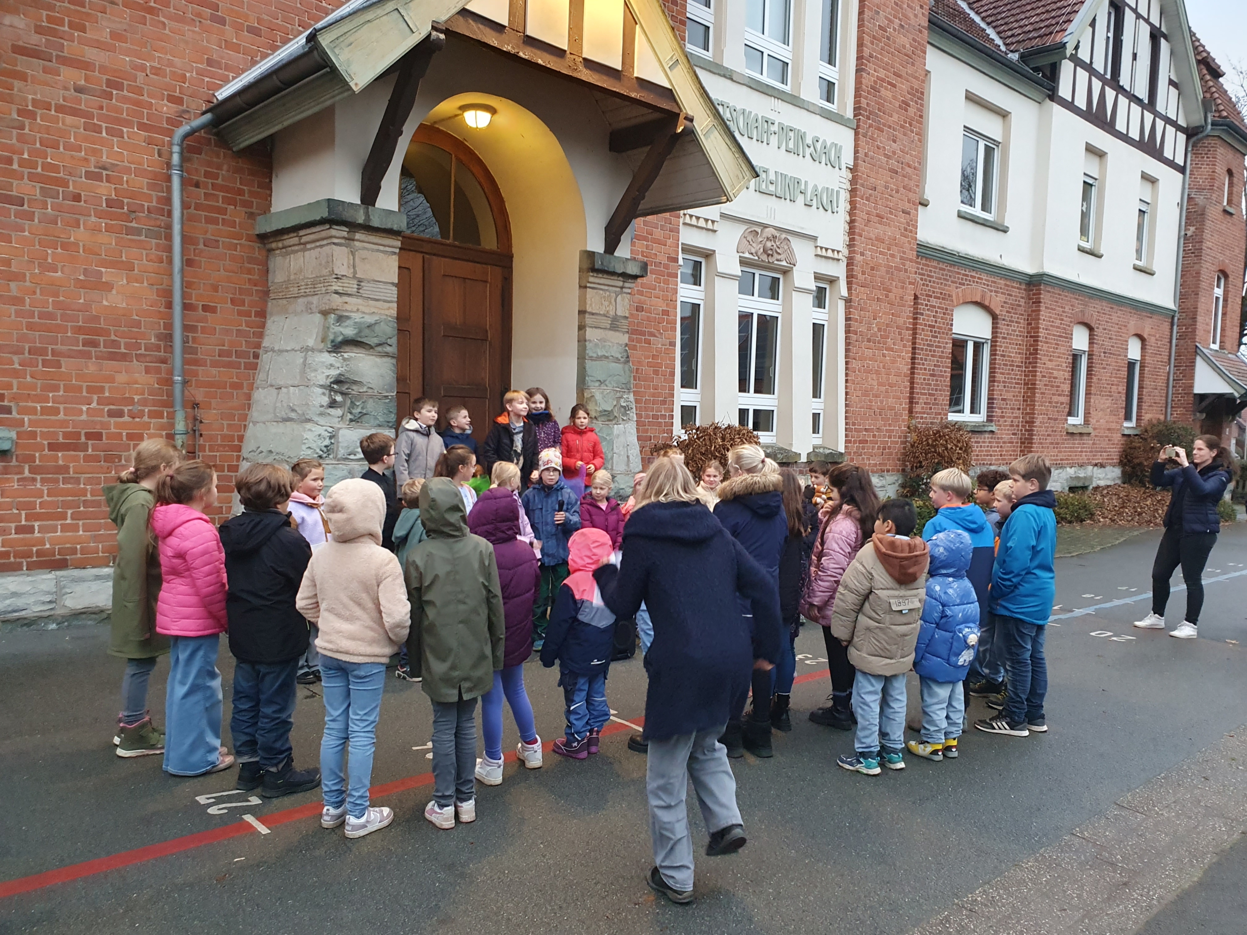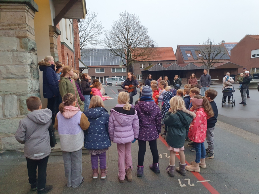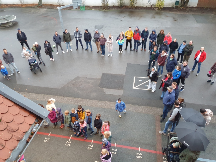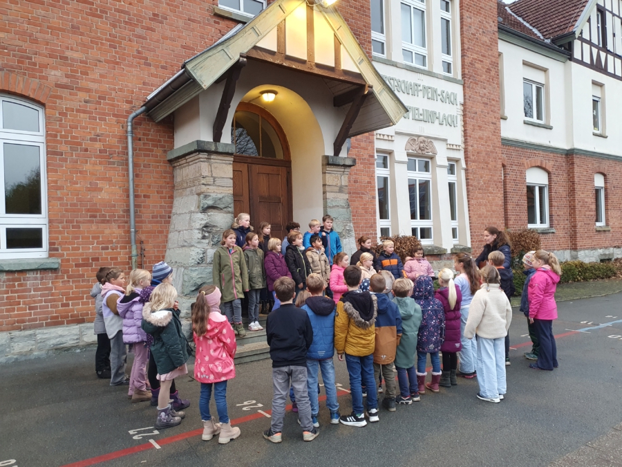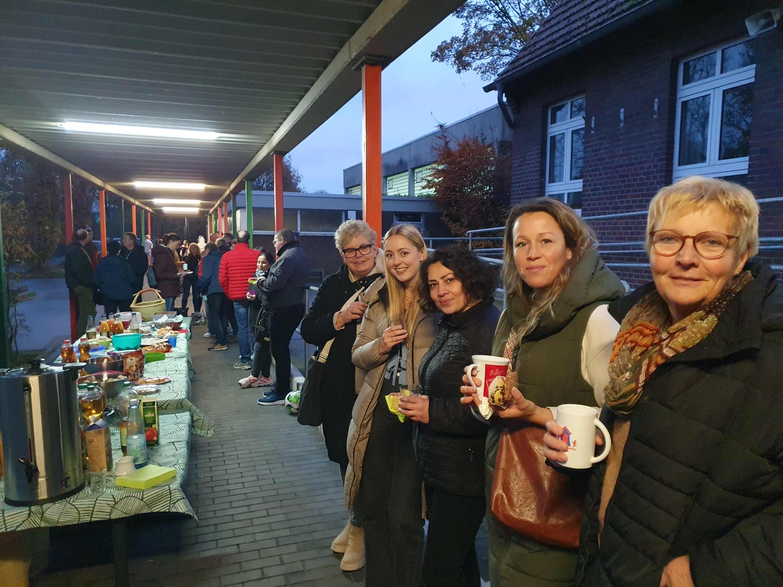 Am Freitag trafen sich die Kinder, Eltern und Lehrkräfte der Eichhörnchen- und Waschbärenklasse zum Kennlernfest des roten Lernhauses. Auch zahlreiche Lernhelfer hatten sich die Zeit genommen, mit dem roten Lernhaus zu feiern. Zum Glück konnte das Fest draußen auf dem Schulhof stattfinden, wo schnell ein tolles Buffet mit vielfältigen und leckeren Speisen und Getränken entstand. Nachdem die Klassenlehrerinnen Julia Elberich und Renate Lohmann die Gäste begrüßt hatten, stimmte die Klasse 3/4 a das Fest mit dem Lied „Die Fledermaus“ ein. Anschließend begrüßte die Klasse 1/2a die Jahreszeit mit einem Herbstgedicht, zu dem sich einige Kinder schwungvoll mit bunten Tüchern bewegten. Am Schluss standen alle Kinder des roten Lernhauses auf der Bühne und schmetterten stimmungsvoll das Lied „Der Herbst ist da“ über die Bühne, das sie mit Frau Elberich eingeübt hatten. Herbstliche Bilder und passende Bewegungen rundeten den Auftritt ab, den Frau Elberich mit ihrer Gitarre begleitete.
