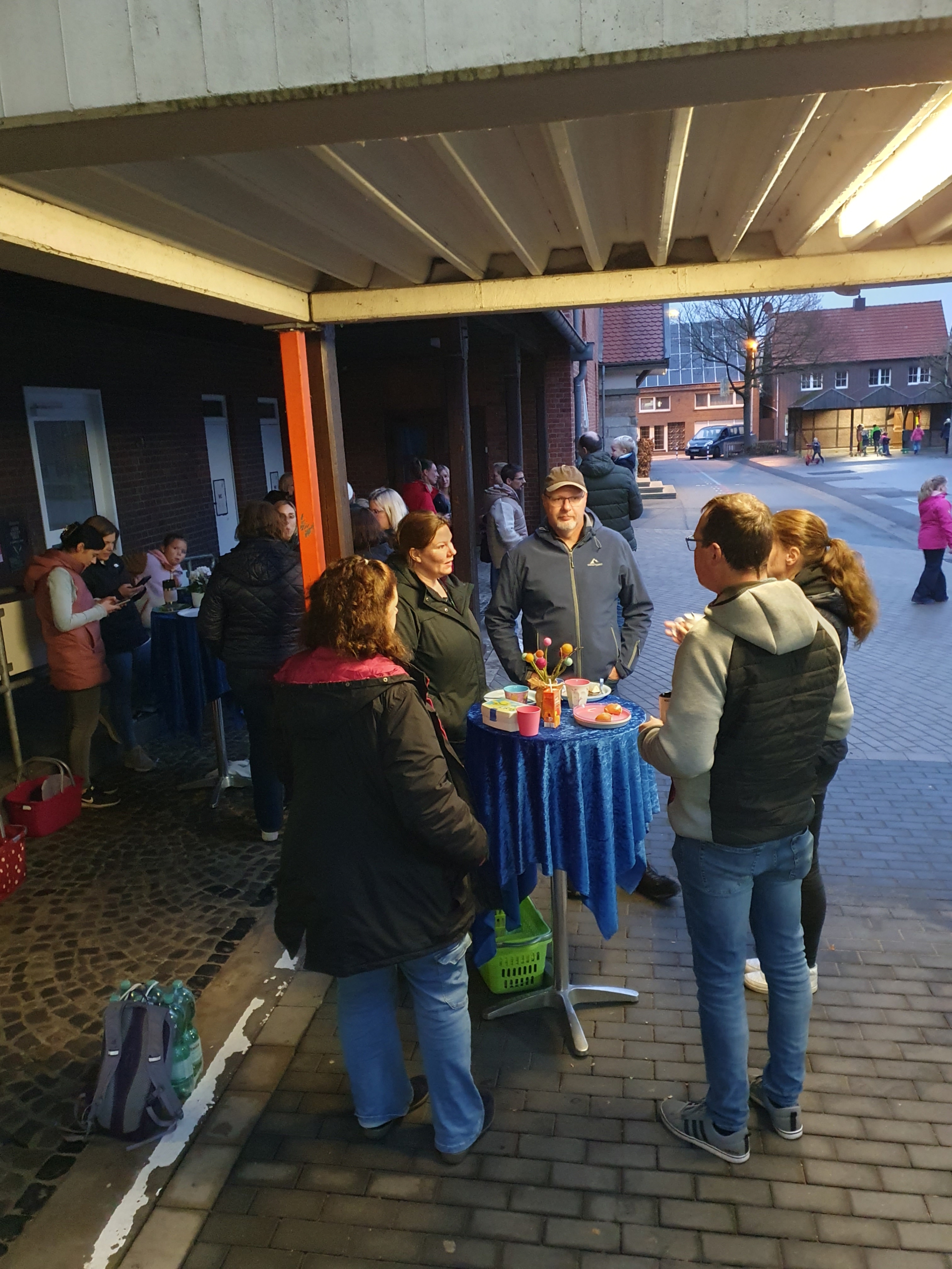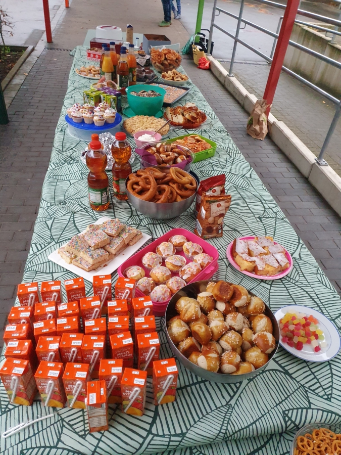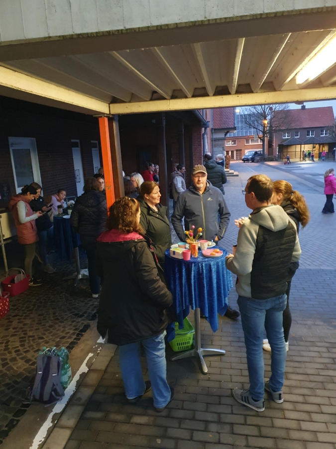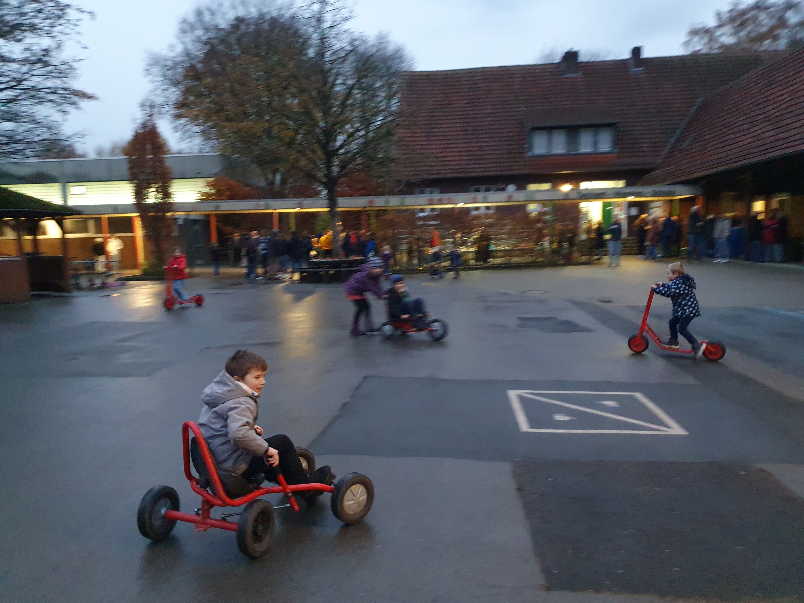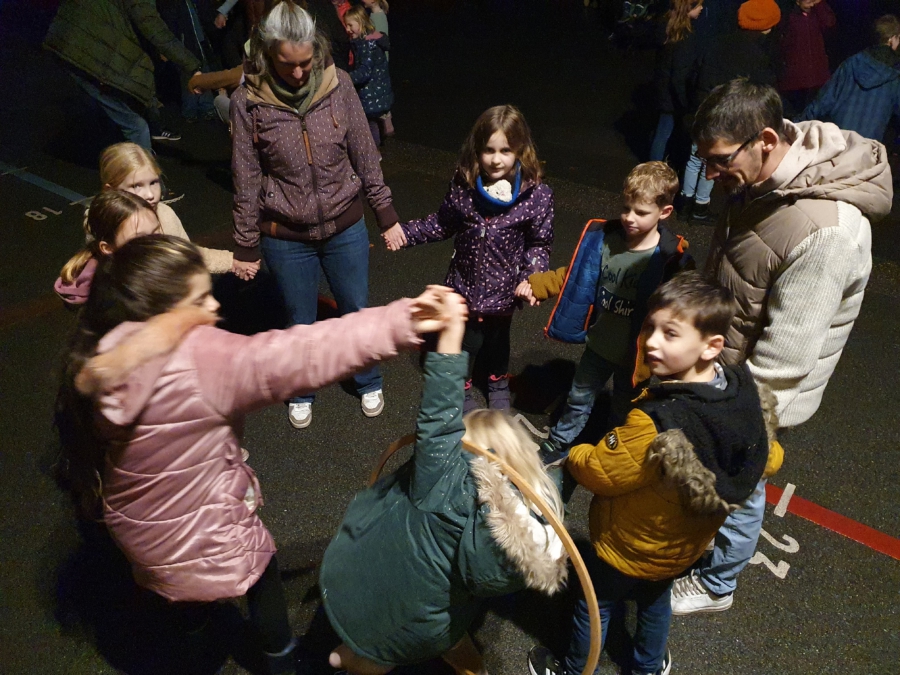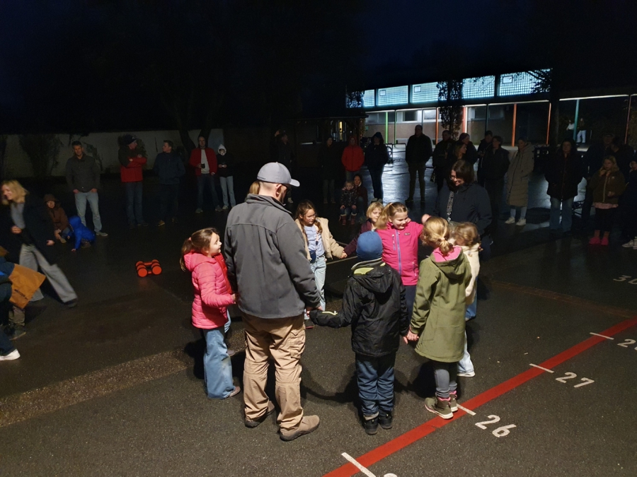 Nach den Aufführungen wurde das bunte Buffet eröffnet, sodass alle Gäste nach Herzenslust schlemmen und sich unterhalten konnten. Gestärkt vom Essen holten sich die Kinder die Spiele und Fahrzeuge aus der Pausenkiste, sodass alle Kinder der Eichhörnchen- und Waschbärenklasse miteinander spielten und Spaß zusammen hatten. Am Ende wurde noch das „Reifenspiel“ gespielt. Vier Gruppen mit Kindern und Eltern aus beiden Klassen bildeten einen Kreis und mussten auf Zeit durch einen Reifen steigen. In drei Minuten schafften es in der Gewinnergruppe sage und schreibe 36 Personen, sich durch den Reifen zu bewegen. Zum Abschluss sangen alle Kinder noch gemeinsam das Lied „Ach herrje, nein wie dumm, schon vorbei, die Zeit ist um…“ Die Zeit verging tatsächlich wie im Flug.