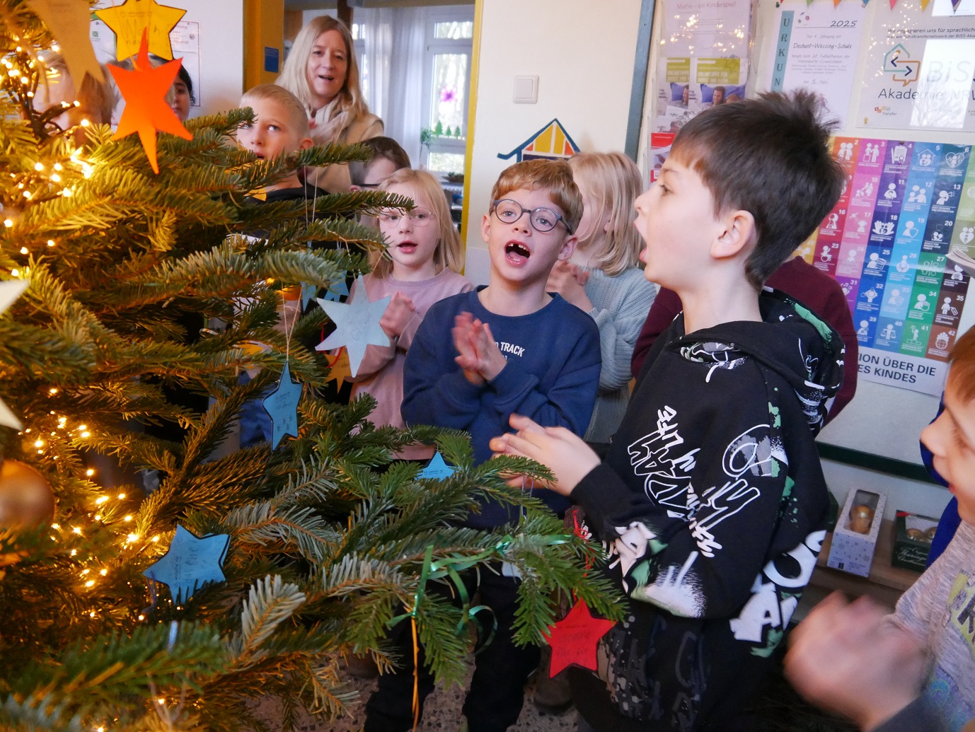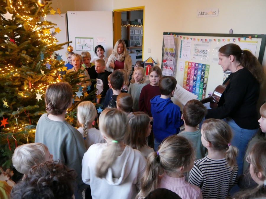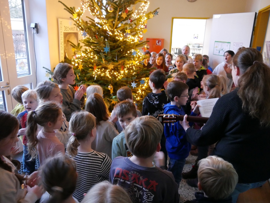 Immer Montags in der ersten Stunde, wenn es noch ein bisschen dämmrig ist, gehen die Kinder der drei Lernhäuser zu einem kurzen Adventssingen in den Flur vor dem Sekretariat. Dort leuchtet der schöne Weihnachtsbaum, außerdem können auch die Kinder, die sonst nicht im „Neubau“ sind, die tolle Krippenlandschaft betrachten.