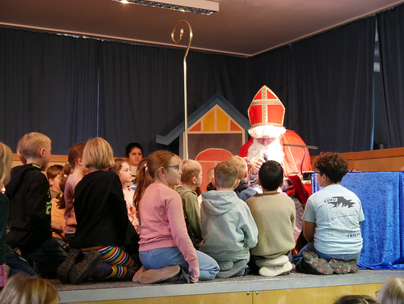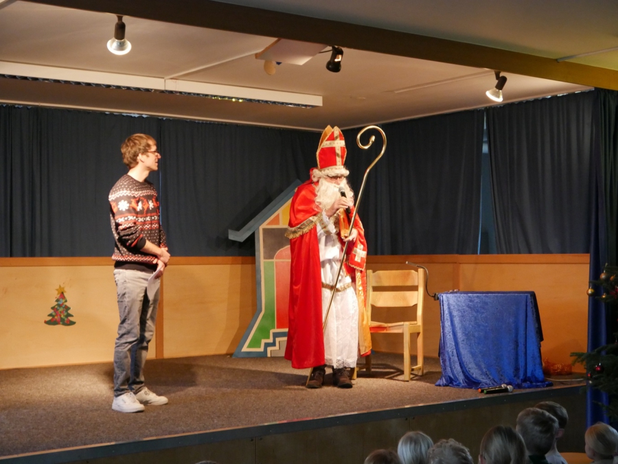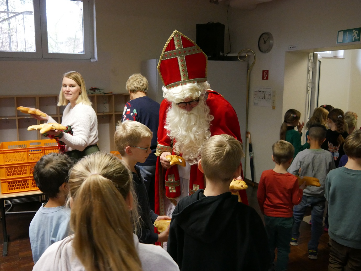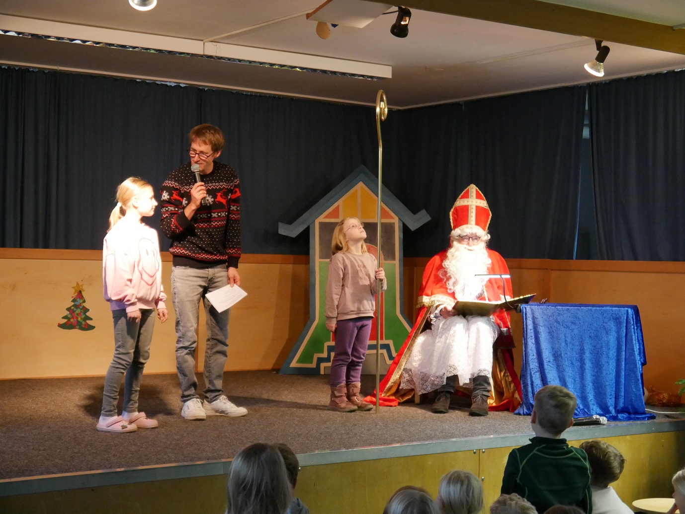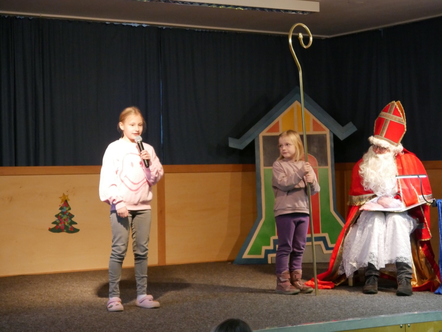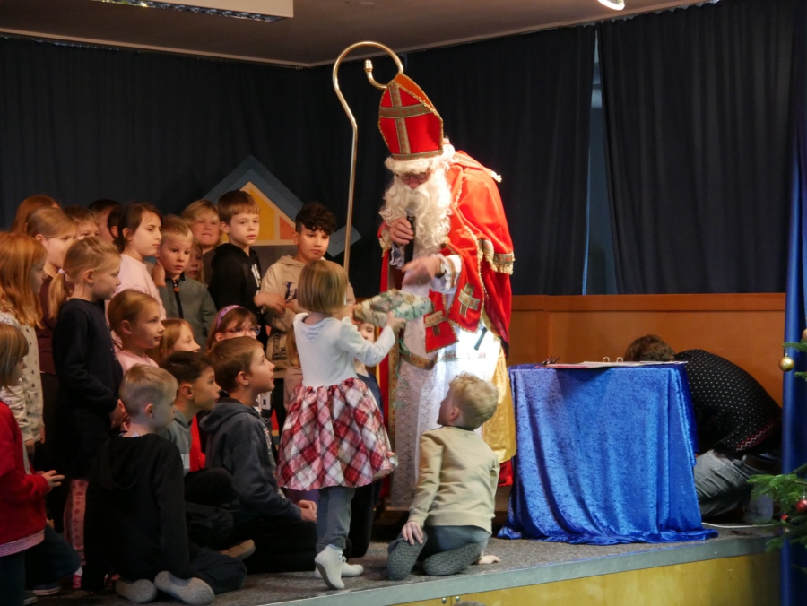 Konrektor Matthias Riediger begrüßte ihn herzlich und übergab sofort an Malea, die mutig ganz allein „Lasst uns froh und munter sein“ auf dem Klavier vorspielte. Lina trug das „Nikolaus-ABC“ vor und bekam anschließend sogar selbst noch ein Ständchen, gemeinsam mit Max, weil beide am heutigen Tag Geburtstag hatten!