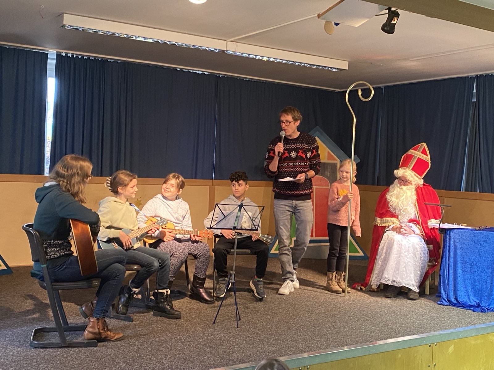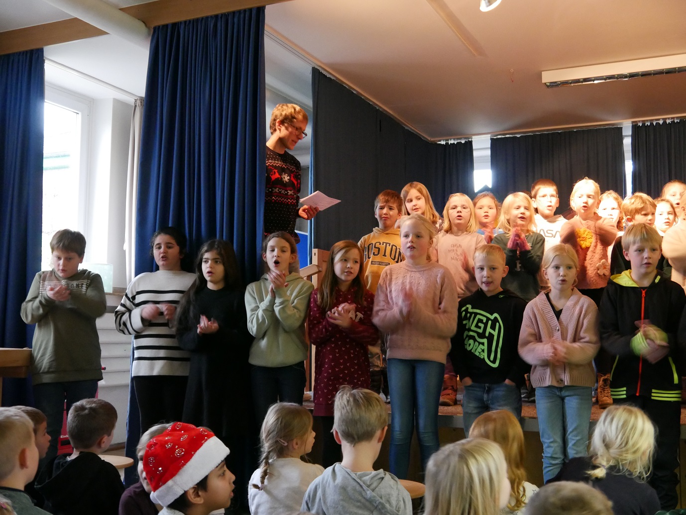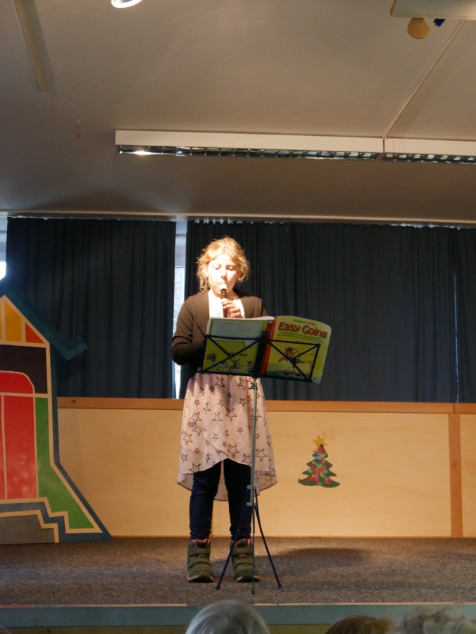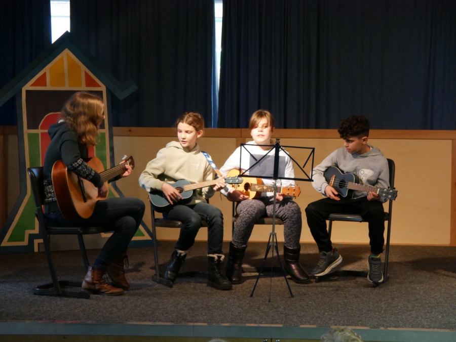 Frau Orthaus präsentierte mit ihrer Ukulelen-AG das Lied „Last christmas“, anschließend trugen Kinder des blauen Lernhauses das lustige Gedicht „Der Nikolausabend“ vor.