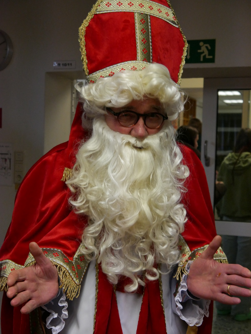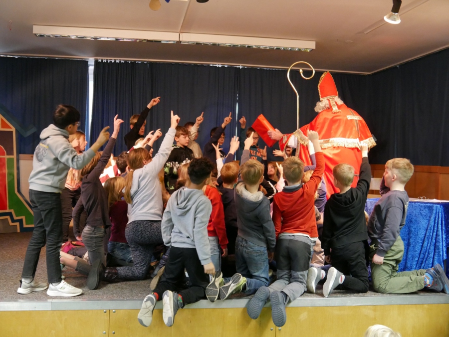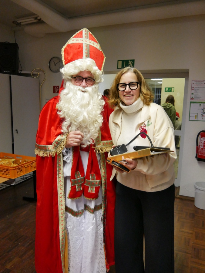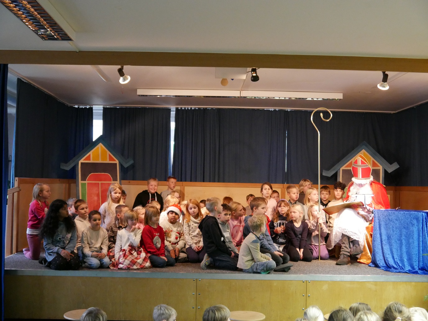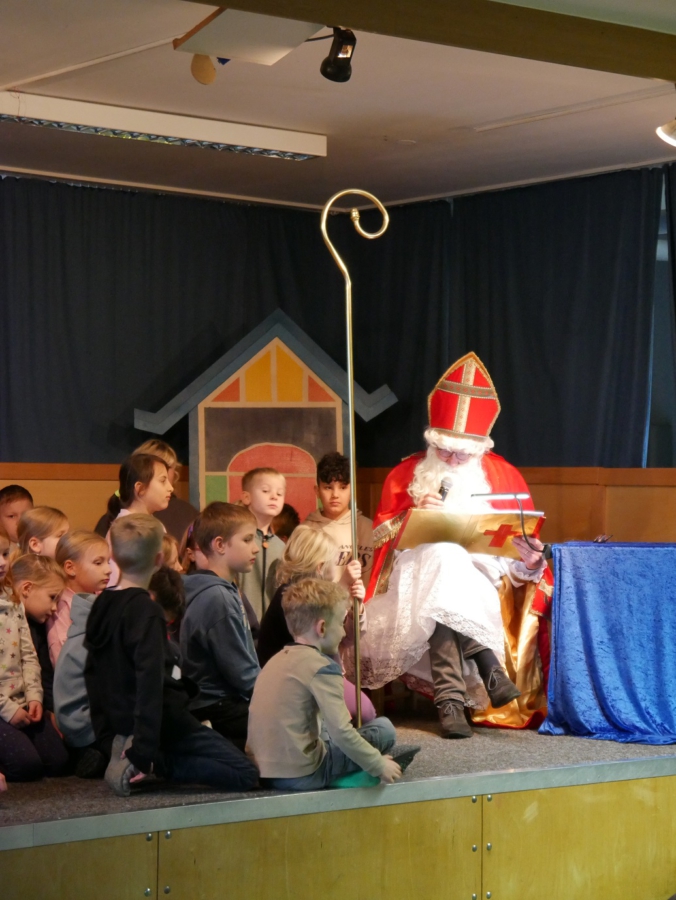 Nach einem schönen Gottesdienst in der St. Lambertuskirche trafen sich alle in der Aula, wo der heilige Mann nicht lange auf sich warten ließ und zu „Sei gegrüßt, lieber Nikolaus“ einzog.