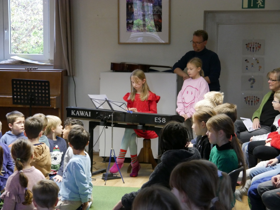 Mit dem roten Lernhaus ging es weiter: Klara spielte „Guter, braver Nikolaus“ auf der Blockflöte und Lara „In der Weihnachtsbäckerei“ auf dem Klavier, bevor alle Kinder „Lasst uns froh und munter sein“ schmetterten.