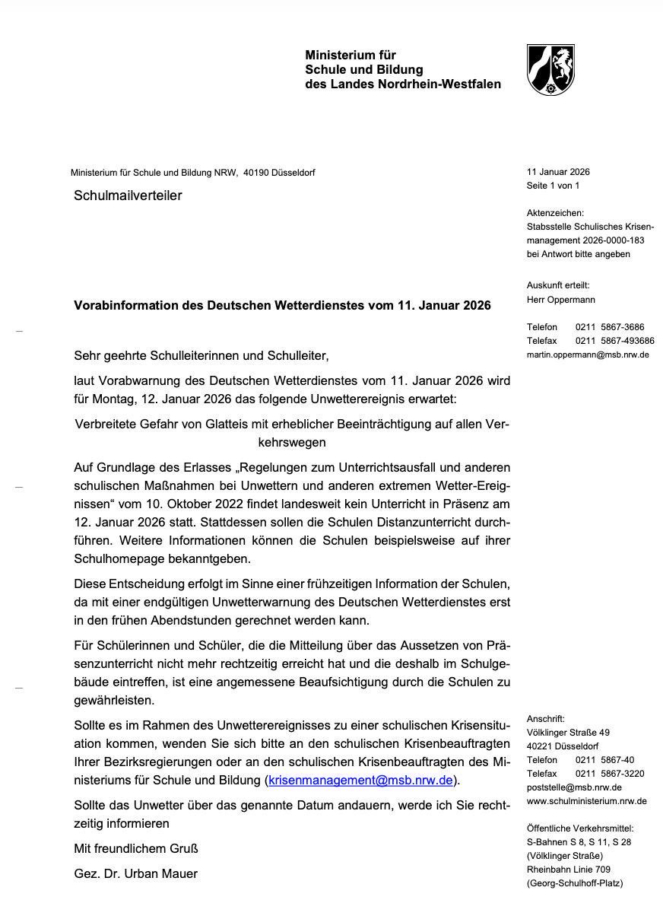 Aufgrund der aktuellen Wetterlage und der offiziellen Entscheidung des Landes Nordrhein-Westfalen fällt der Unterricht am morgigen Montag, 12.01.26, landesweit aus.