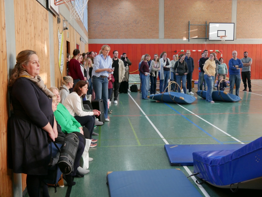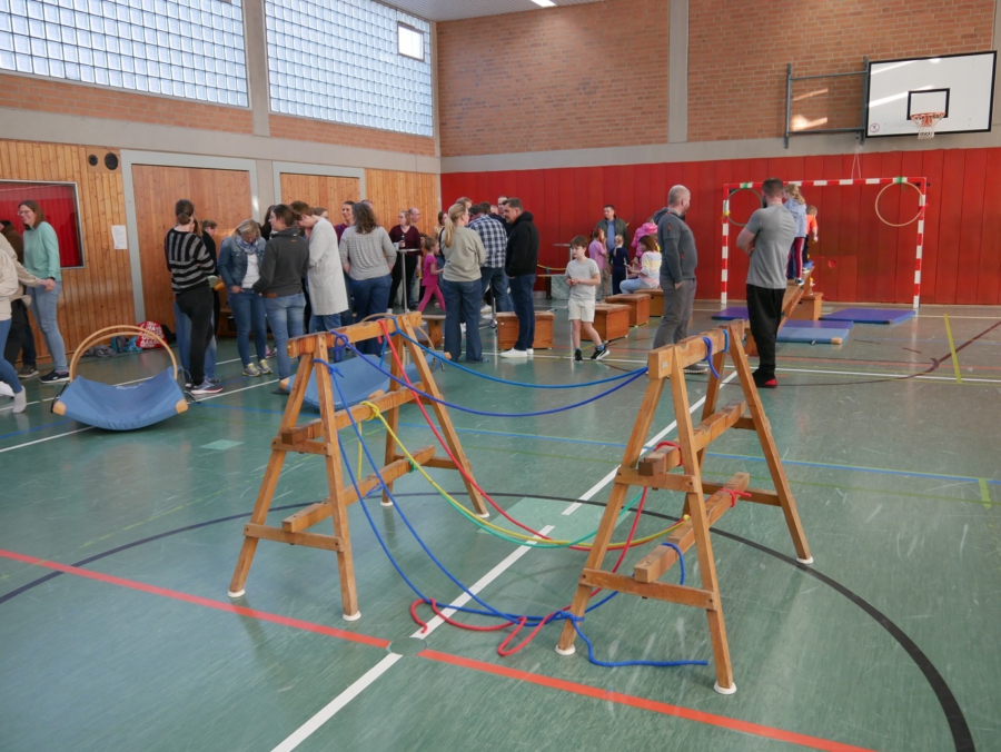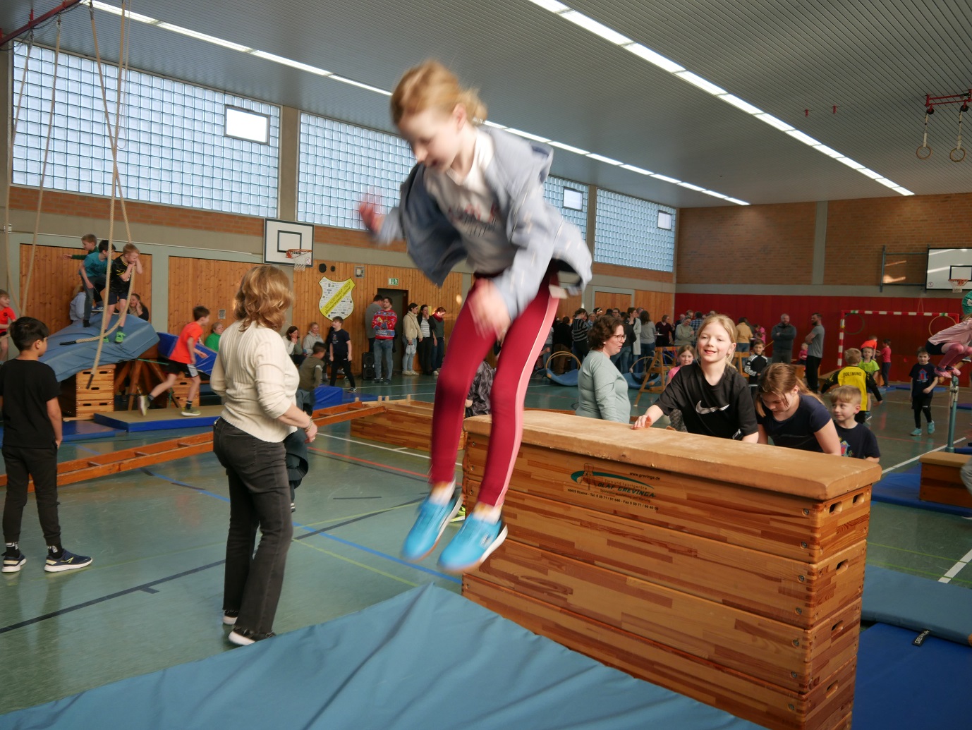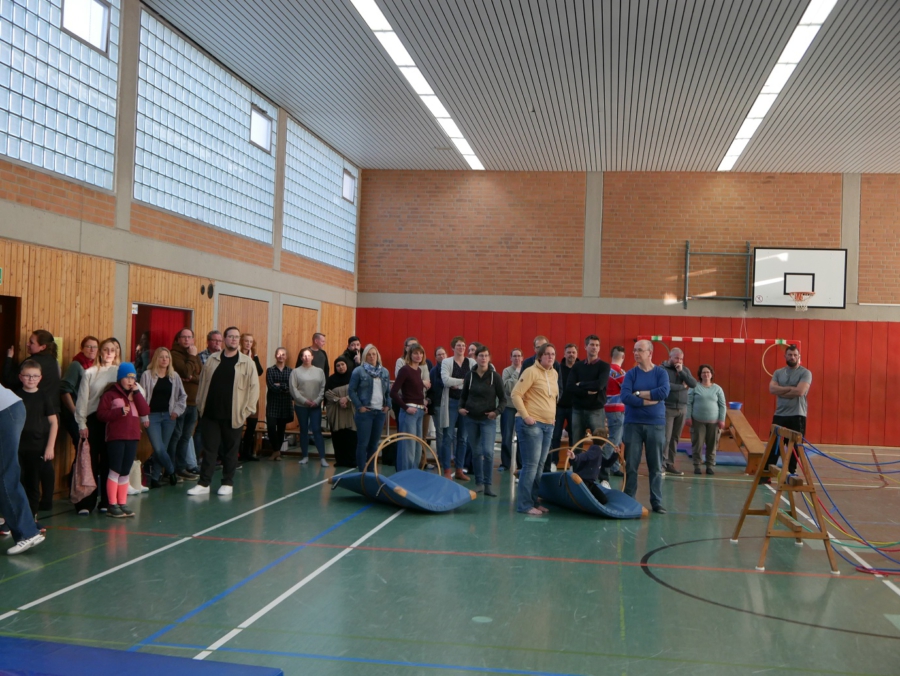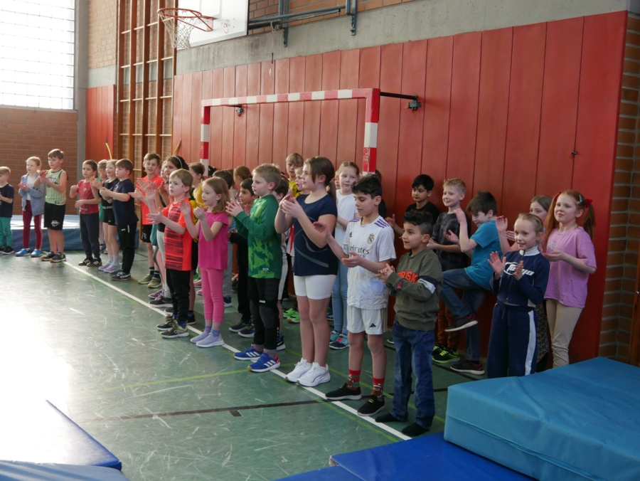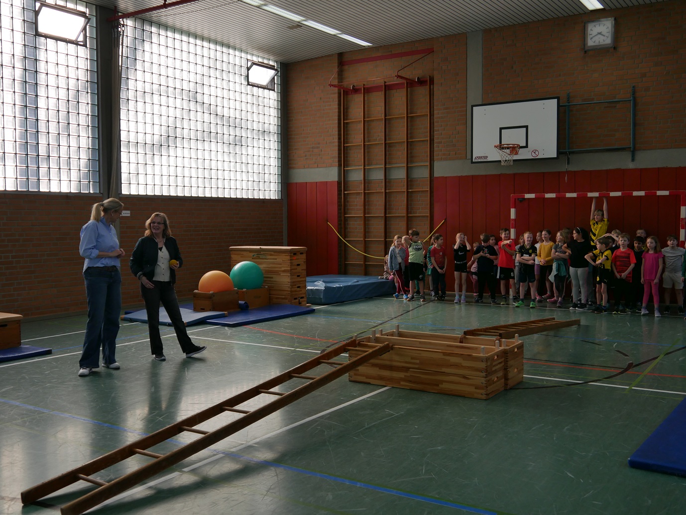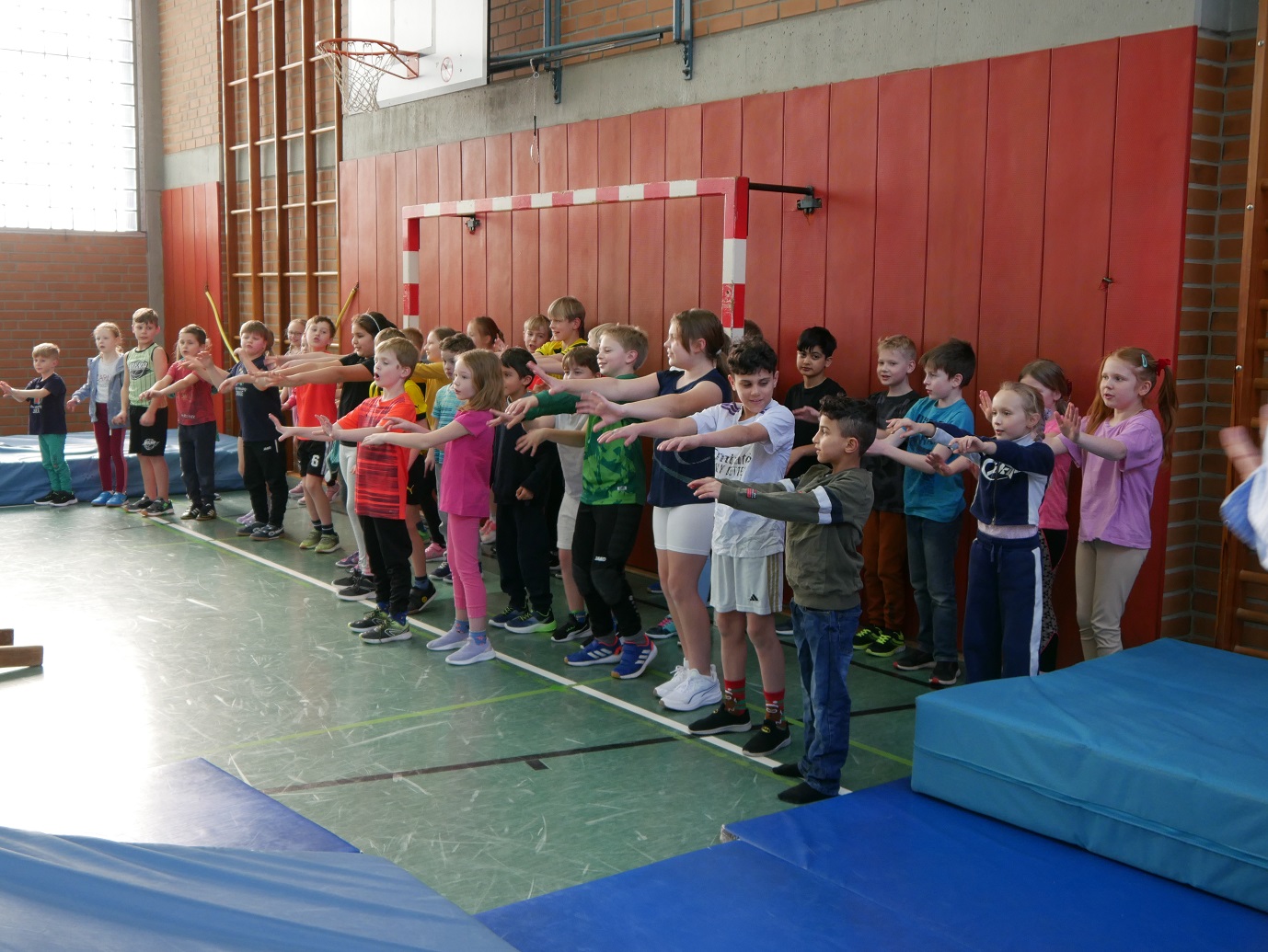 Die Pinguine aus der Klasse 1/2b und die Wale aus der Klasse 3/4b verbrachten zusammen einen sportlichen und fröhlichen Nachmittag in der Turnhalle. Gemeinsam mit ihren Lehrerinnen Frau Farwick, Frau Köster und Frau Lammerding erlebten sie dort einen spannenden Geräteparcours, der den Kindern viele Möglichkeiten bot, sich auszutoben, auszuprobieren und ihre Geschicklichkeit zu zeigen.