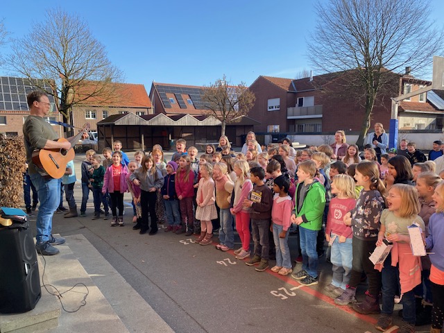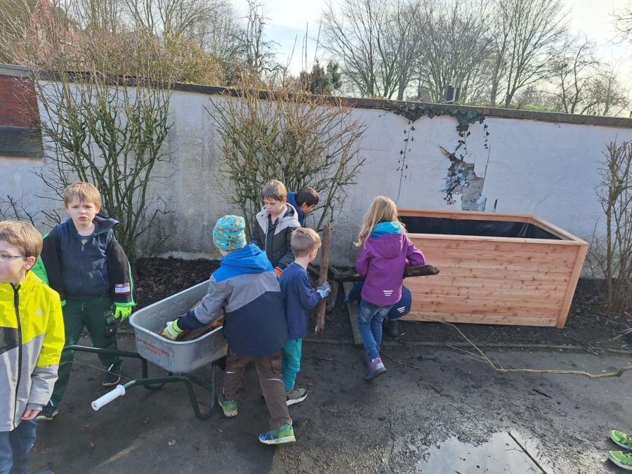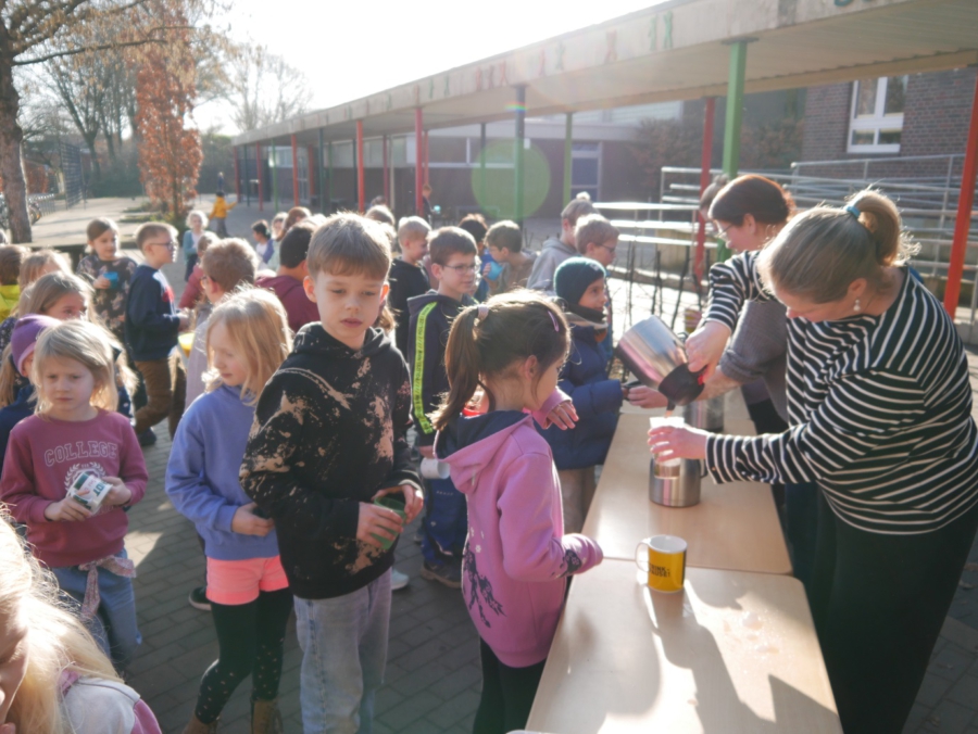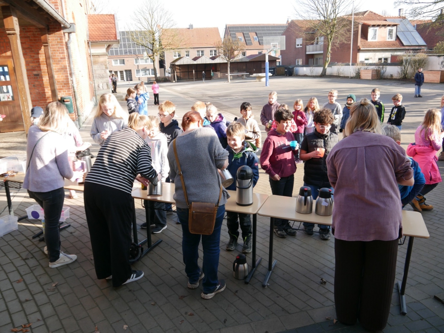 Am Freitag gab es in der großen Pause bei strahlendem Sonnenschein als kleine Belohnung für den riesigen Einsatz der Kinder heißen Kakao – gespendet von Familie Recker mit dem Edeka-Markt Neubeckum.