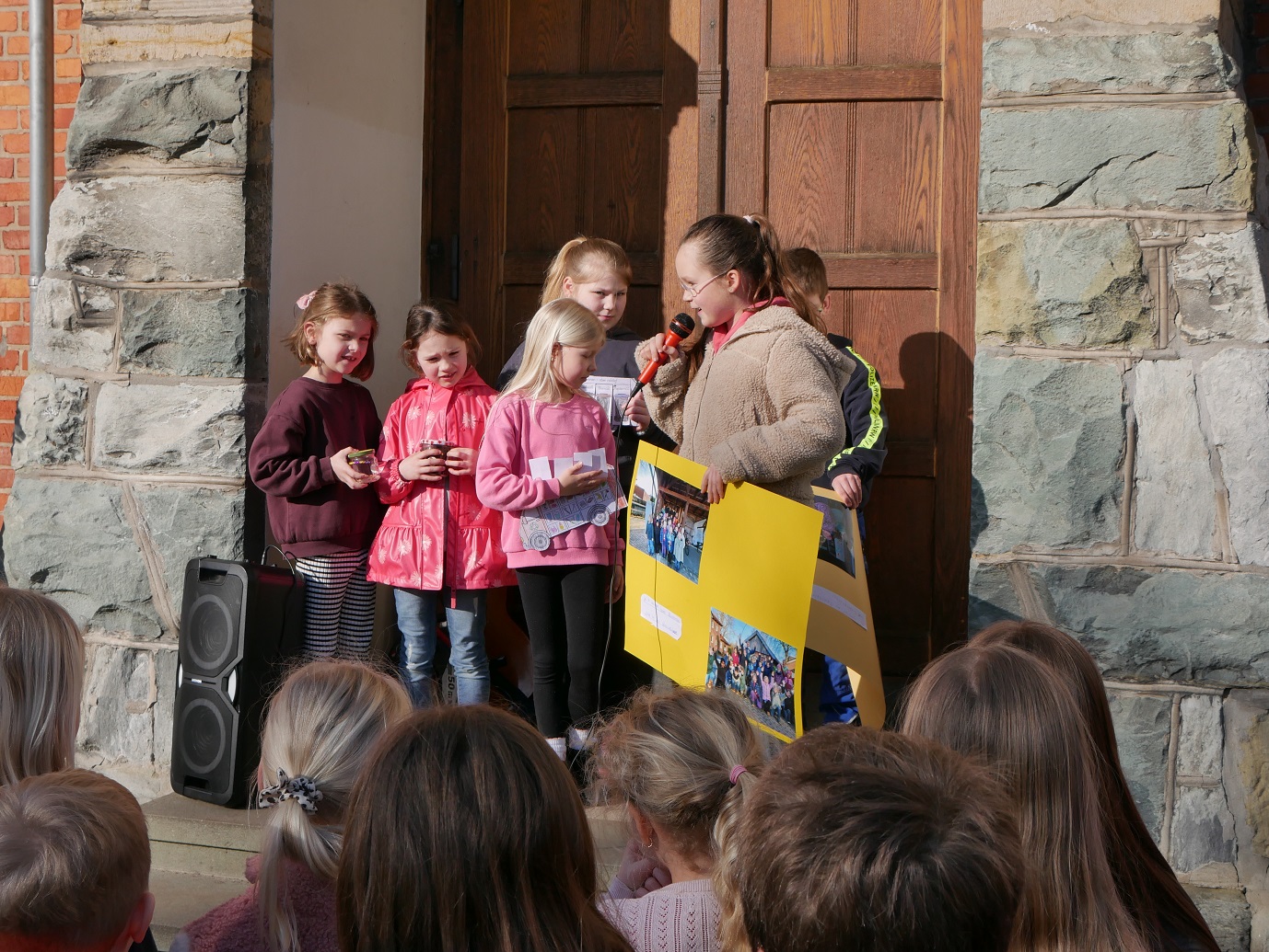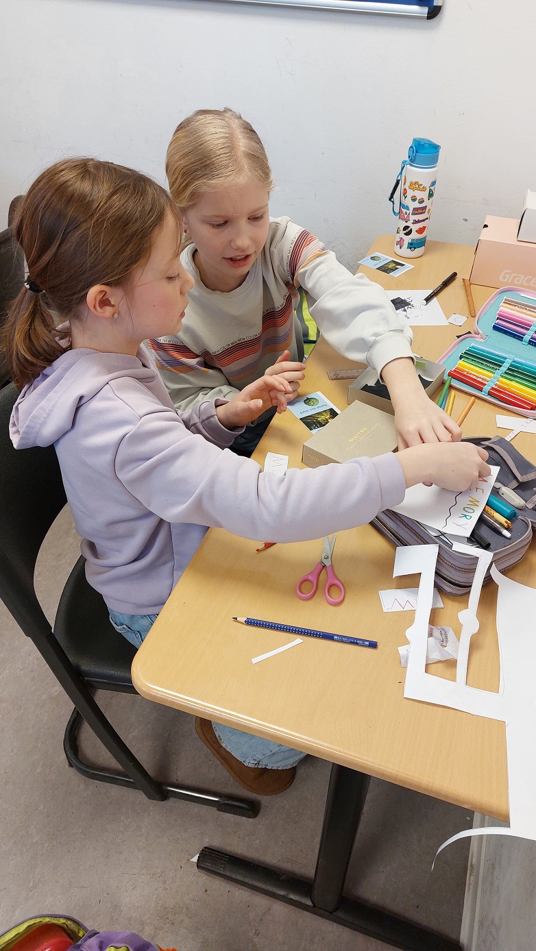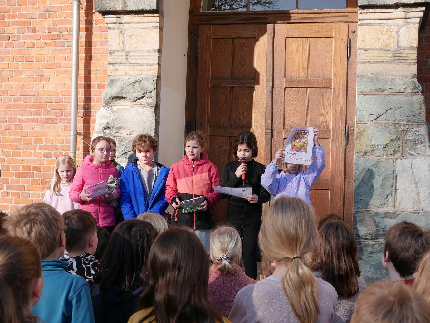Eine Gruppe hatte aus Müll nützliche Gegenstände gebaut, z.B. kleine Vogelhäuschen, andere stellten plastikfreie Spiele und Mini-Gewächshäuser selbst her. Eine andere hatte zu jeweils einem Ziel einen Schuhkarton gestaltet, in dem z.B. saubere Energiearten nachgebaut wurden. Ein echter Imker kam zu Besuch und berichtete von der Pflege der wichtigsten Tierart für uns Menschen – die Biene! Entsprechend wurden Wildblumenbeete angelegt und Insektenhotels gebastelt. Als Alternative zu dem bekannten Sponsorenlauf wird eine Klasse für unicef eine ganze Woche lang lesen und mit dem Erlös hilfsbedürftige Kinder auf Madagascar unterstützen. Wie auch an einigen Stellen im Dorf wird es nun auch an der DWS ein „Tauschregal“ geben, um Dinge abzugeben und zu nehmen, die zum Wegwerfen zu schade sind. Um am besten ganz Hoetmar mit anzustecken, hatte eine Gruppe kleine Flyer hergestellt, die zum Umweltschutz aufriefen und sowohl an der Schule als auch im Dorf verteilt wurden.