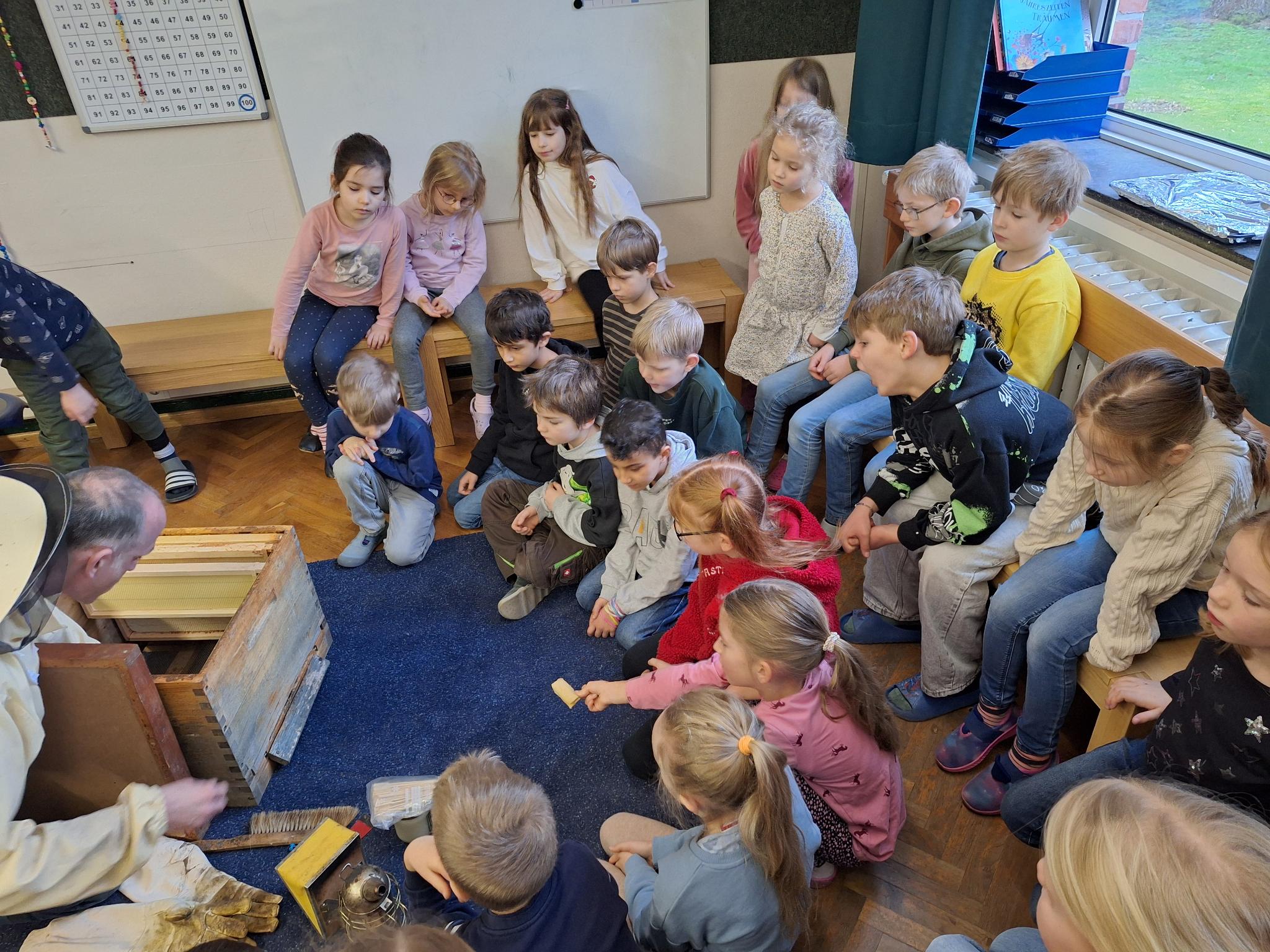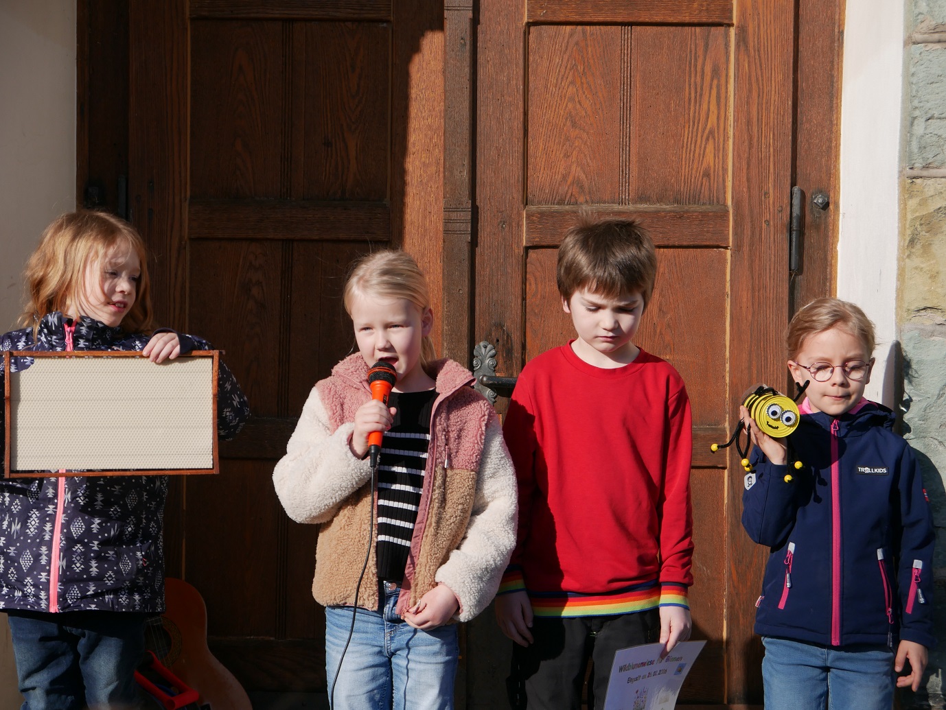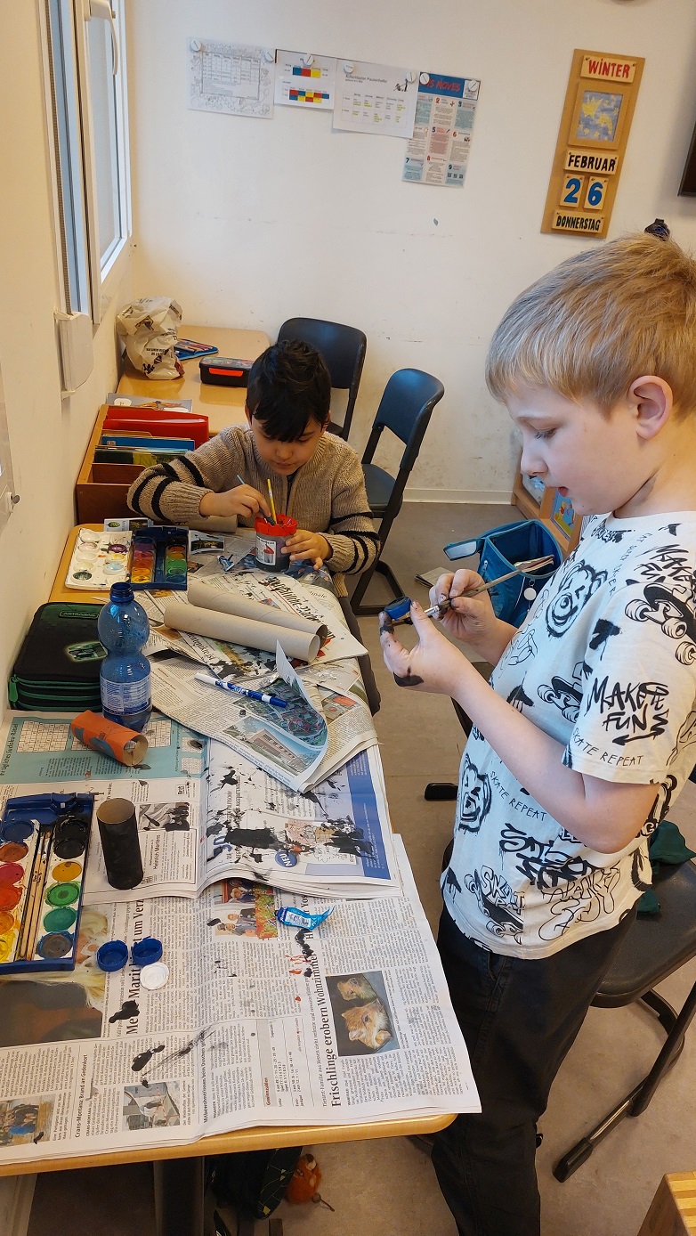 Eine Gruppe hatte aus Müll nützliche Gegenstände gebaut, z.B. kleine Vogelhäuschen, andere stellten plastikfreie Spiele und Mini-Gewächshäuser selbst her. Eine andere hatte zu jeweils einem Ziel einen Schuhkarton gestaltet, in dem z.B. saubere Energiearten nachgebaut wurden. Ein echter Imker kam zu Besuch und berichtete von der Pflege der wichtigsten Tierart für uns Menschen – die Biene! Entsprechend wurden Wildblumenbeete angelegt und Insektenhotels gebastelt. Als Alternative zu dem bekannten Sponsorenlauf wird eine Klasse für unicef eine ganze Woche lang lesen und mit dem Erlös hilfsbedürftige Kinder auf Madagascar unterstützen. Wie auch an einigen Stellen im Dorf wird es nun auch an der DWS ein „Tauschregal“ geben, um Dinge abzugeben und zu nehmen, die zum Wegwerfen zu schade sind. Um am besten ganz Hoetmar mit anzustecken, hatte eine Gruppe kleine Flyer hergestellt, die zum Umweltschutz aufriefen und sowohl an der Schule als auch im Dorf verteilt wurden.
