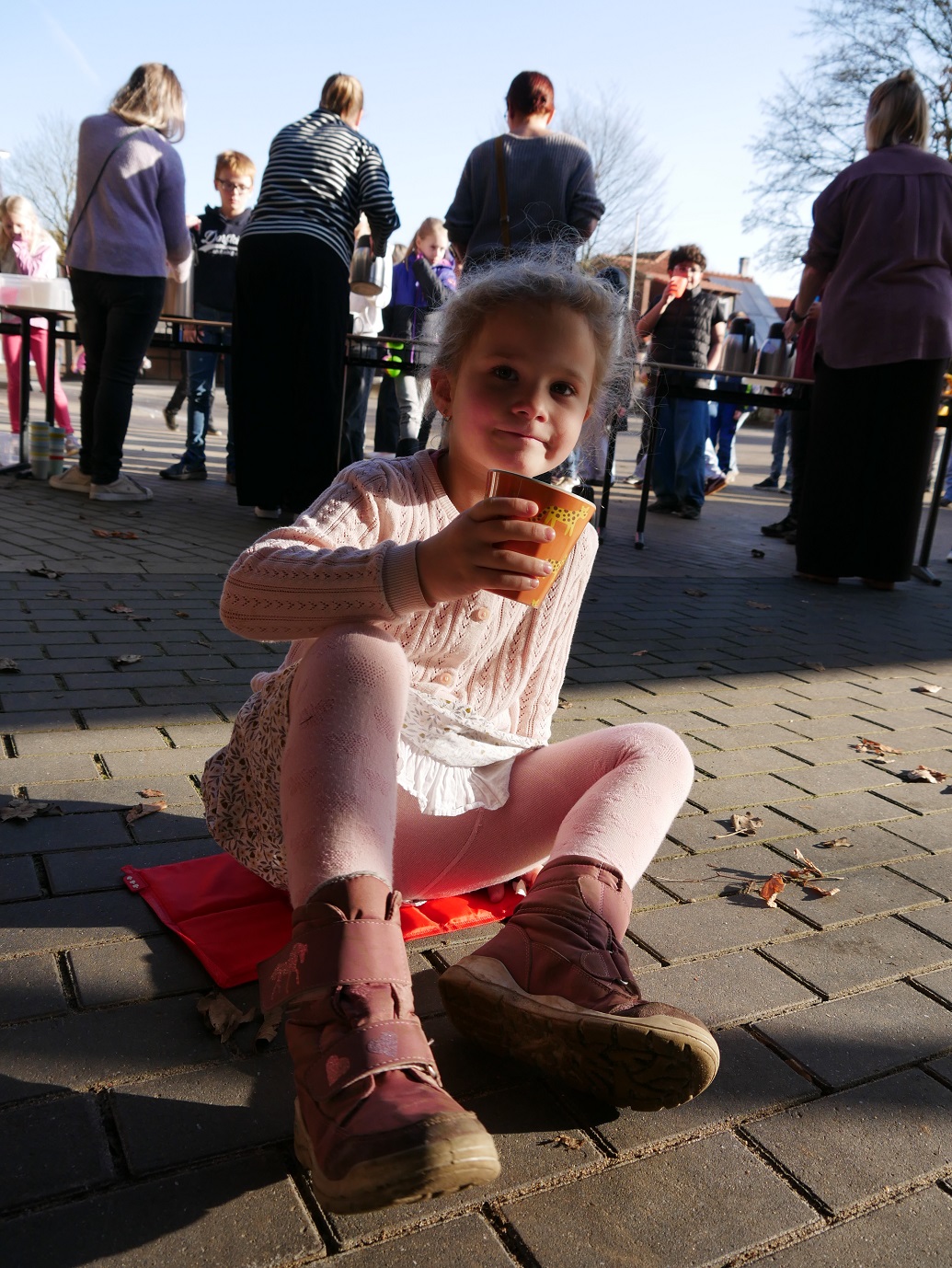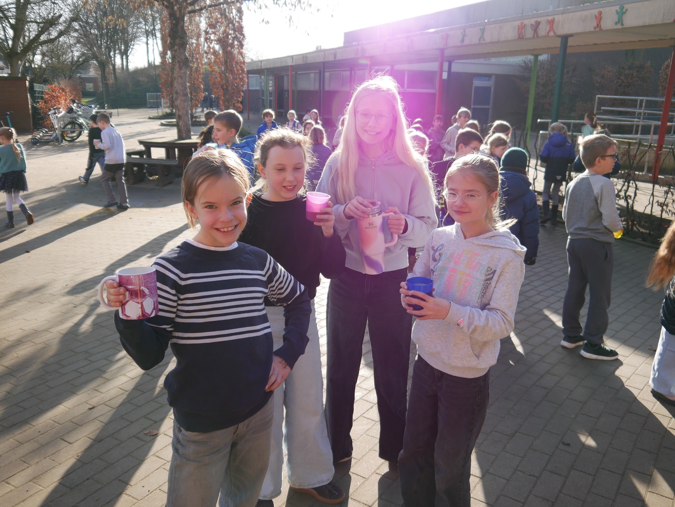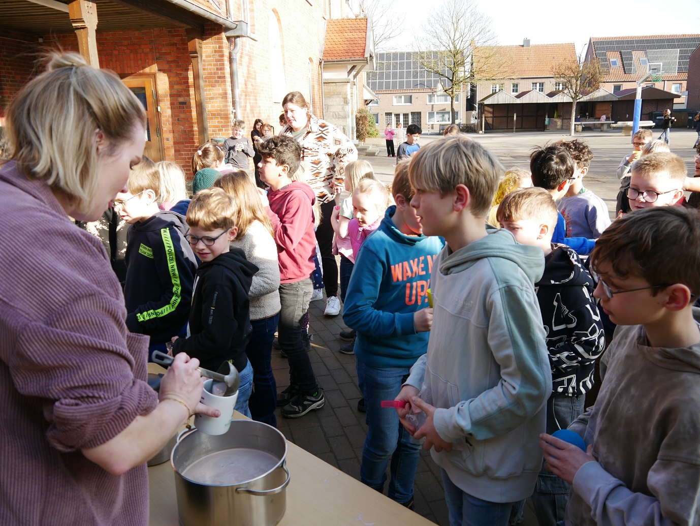 Am Freitag gab es in der großen Pause bei strahlendem Sonnenschein als kleine Belohnung für den riesigen Einsatz der Kinder heißen Kakao – gespendet von Familie Recker mit dem Edeka-Markt Neubeckum.