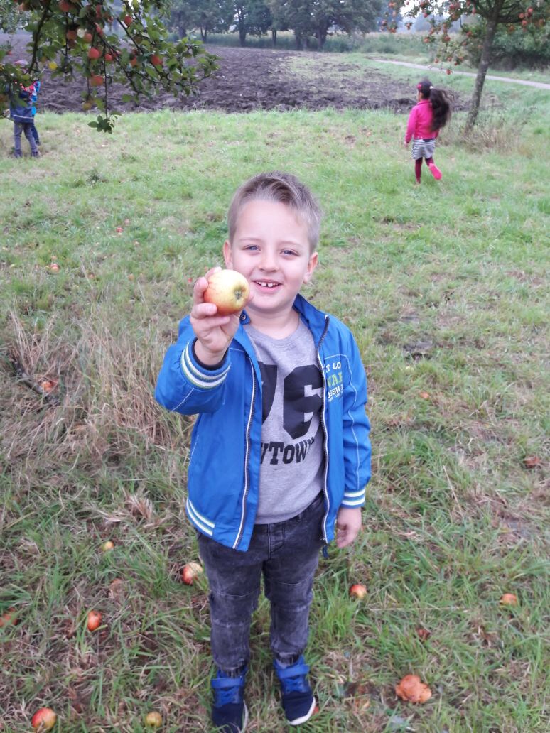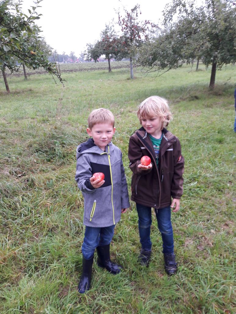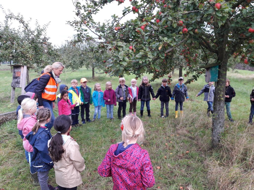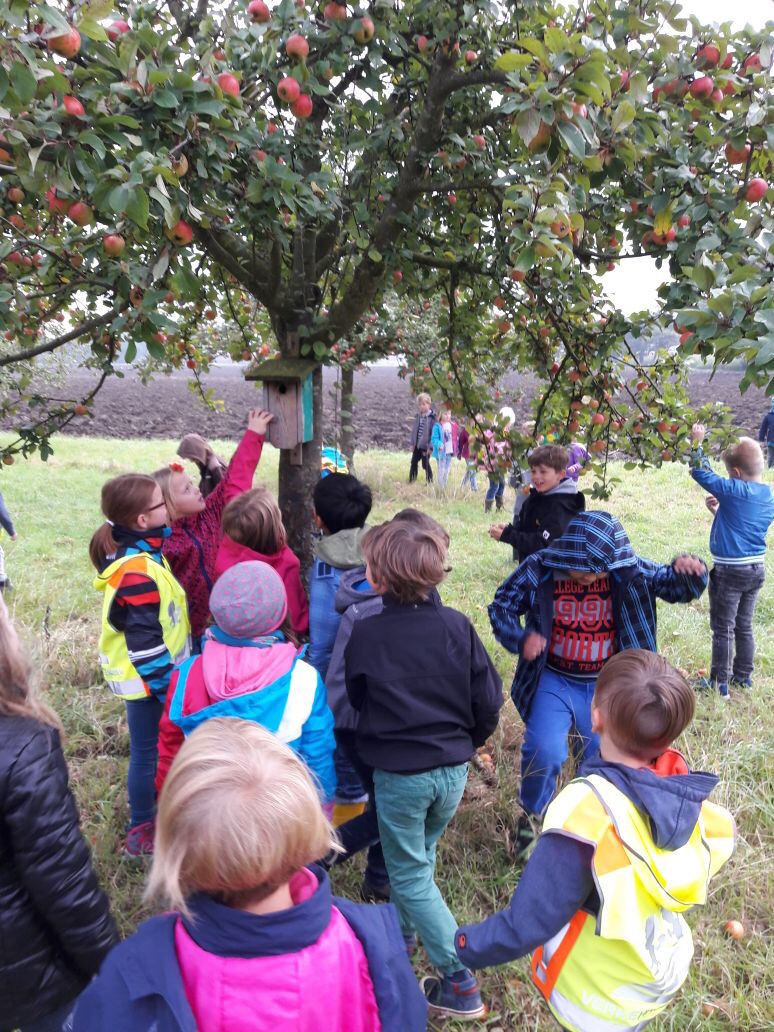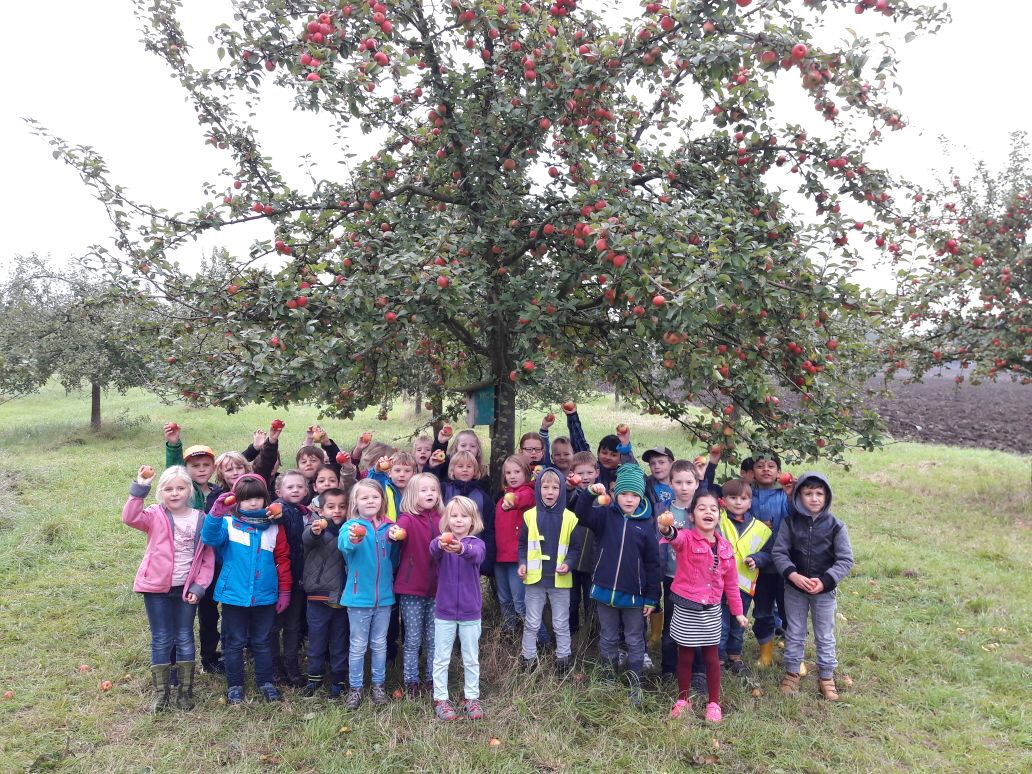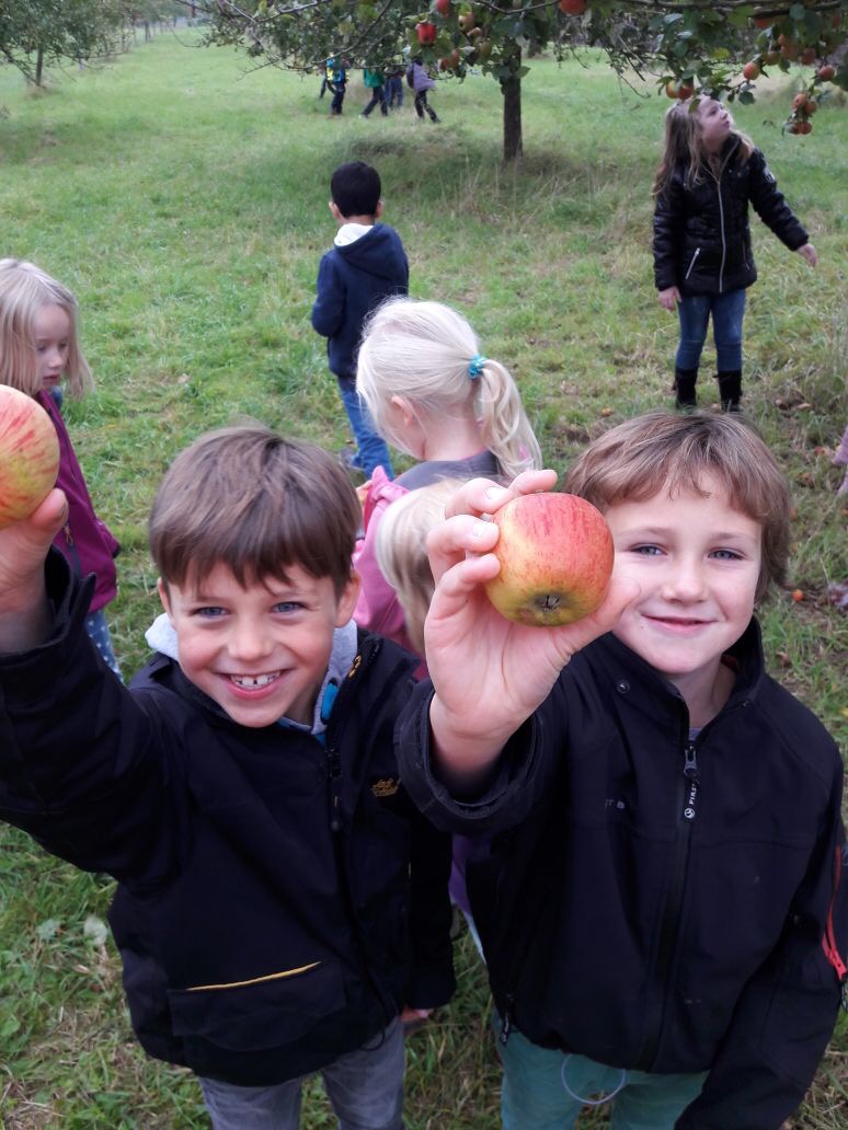 Zu Beginn des Themas unternahmen die beiden ersten Klassen gemeinsam einen Ausflug zu einer nahegelegenen Obstwiese mit reich bestückten Apfelbäumen. Hier wurde entdeckt, gespielt, gesungen und zu guter Letzt durfte sich jedes Kind für die Frühstückspause einen besonders schönen Apfel mitnehmen.