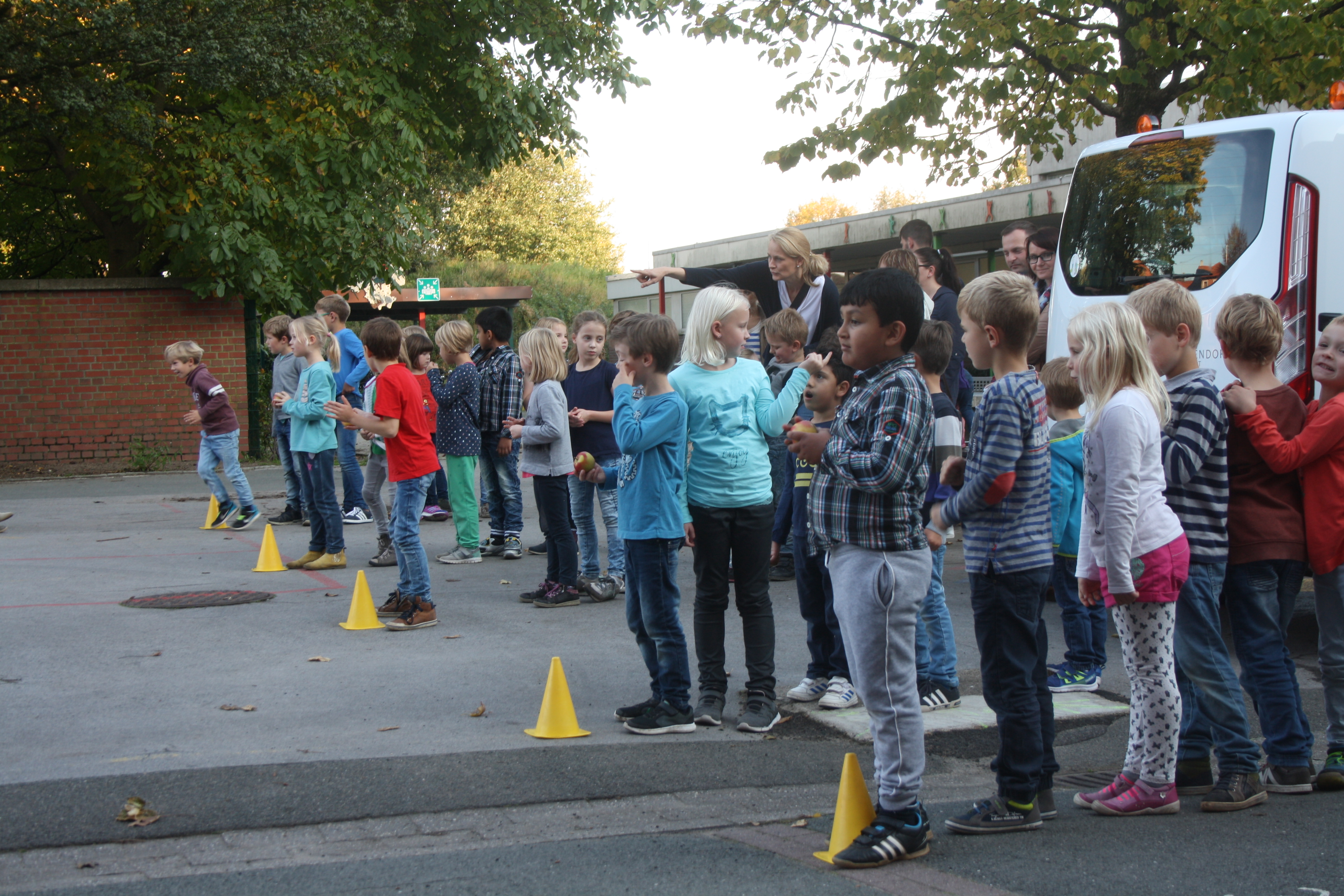 Stolz strahlen die Kinder der vierten Klasse der Dechant-Wessing-Schule: Endlich haben sie ihre Radfahrprüfung abgelegt! Viele Wochen lang hatten sie sich im Rahmen des Sachunterrichts darauf vorbereitet und das sichere Radfahren trainiert, sowohl mit der ganzen Klasse auf dem Schulhof als auch in kleinen Gruppen bei Radtouren durch den Ort. Dies wurde durch das Engagement von Eltern ermöglicht, die als Begleiter dabei waren und auf das Einhalten der besprochenen Verkehrs- und Verhaltensregeln achteten: Wie fahre ich richtig los? Wie werde ich in der dunklen Jahreszeit gut gesehen? Woran muss ich beim Linksabbiegen denken? Wer hat an der Kreuzung Vorfahrt? Damit keine Fragen offen blieben, kam natürlich auch die Theorie nicht zu kurz. Hier mussten alle Kinder ihr Wissen mit Hilfe eines Testbogens nachweisen. Aber im Mittelpunkt stand selbstverständlich die praktische Übung, wozu übrigens auch das selbstständige Flicken eines kaputten Reifens zählte. Am 16. Oktober kamen schließlich Ralf Kesse und Bodo Kowatz von der Unfallprävention der Kreispolizei an die DWS, um sowohl das Fahrverhalten der Kinder wie auch die Verkehrssicherheit der Räder zu überprüfen. Die beiden Polizeibeamten zeigten sich sehr beeindruckt von der guten Vorbereitung der Viertklässler und bedankten sich bei den Lehrkräften und Eltern für die intensive Unterstützung. Nachdrücklich wiesen beide allerdings auch darauf hin, dass die erfolgreiche Radfahrprüfung nicht den Abschluss des Lernprozesses bedeutet. Noch viele Jahre müssen die Mädchen und Jungen regelmäßig üben, bevor sie die vielfältigen und oft unübersichtlichen Verkehrssituationen selbstständig sicher beurteilen und entsprechend reagieren können.