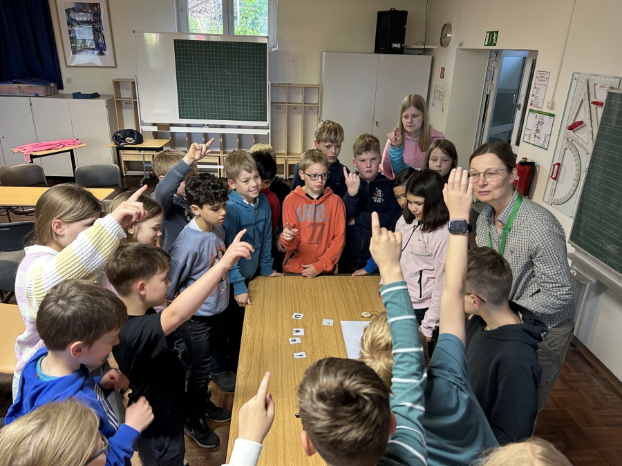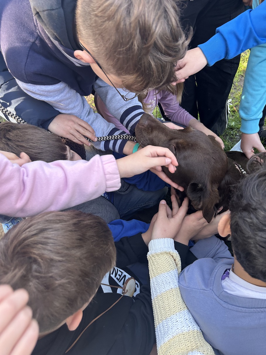 Draußen auf der grünen Pause gab es dann noch eine besondere Überraschung: „Taylor“, eine echte Jagdhündin, mit ihrem Herrchen Anton. Dieser erklärte wichtige Grundlagen und Aufgaben bei der Arbeit mit Jagdhunden und demonstrierte einige Übungen zum Apportieren, die Taylor sichtlich Spaß machten. Für die Kinder war es der perfekte Abschluss einer unterhaltsamen und informativen Unterrichtseinheit zum Thema „Wald“!