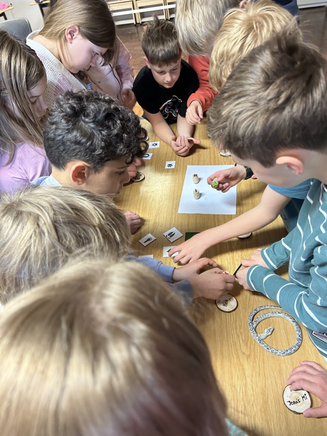 In der Aula trafen sich dann nacheinander an zwei Tagen die Kinder der drei Lerngruppen 3/4. Als erstes durfte jeder ein Namensschild aus einer kleinen Baumscheibe basteln, bevor es eine kurze Präsentation einer typischen Tierart gab – individuell passend zu jedem Lernhaus Reh, Stockente und Fasan. In Kleingruppen erhielten die Kinder Informationen zu weiteren Tierarten, die sie dann auch selbst vorstellen konnten. Marie aus dem gelben Lernhaus hatte darüber hinaus selbst Geweihstücke eines Damhirsches mitgebracht.